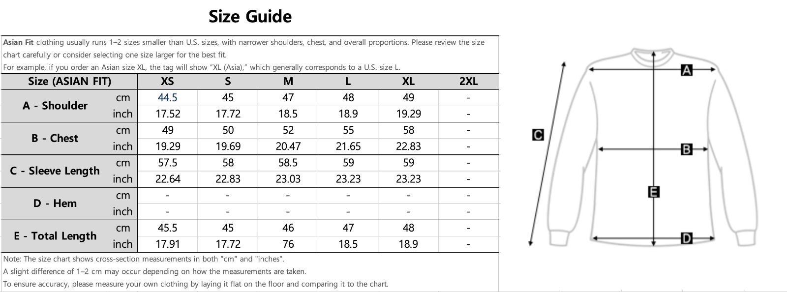 Asian Fit refers to clothing tailored for body shapes commonly found in Asian populations. These items typically run 1-2 sizes smaller than U.S. sizes, with narrower shoulders, chest, and overall proportions. Please check the size chart carefully or consider sizing up for the best fit.