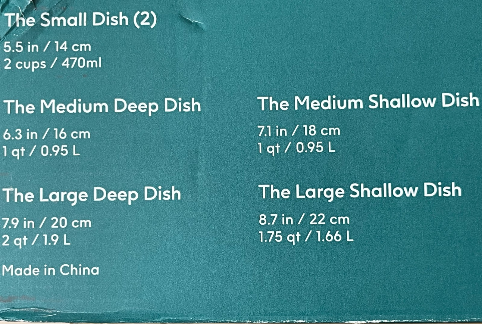 Large Deep Dish: 8" diam., 4 1/4" high; 2-qt. (8-cup) cap.; 3 lb. with lid.