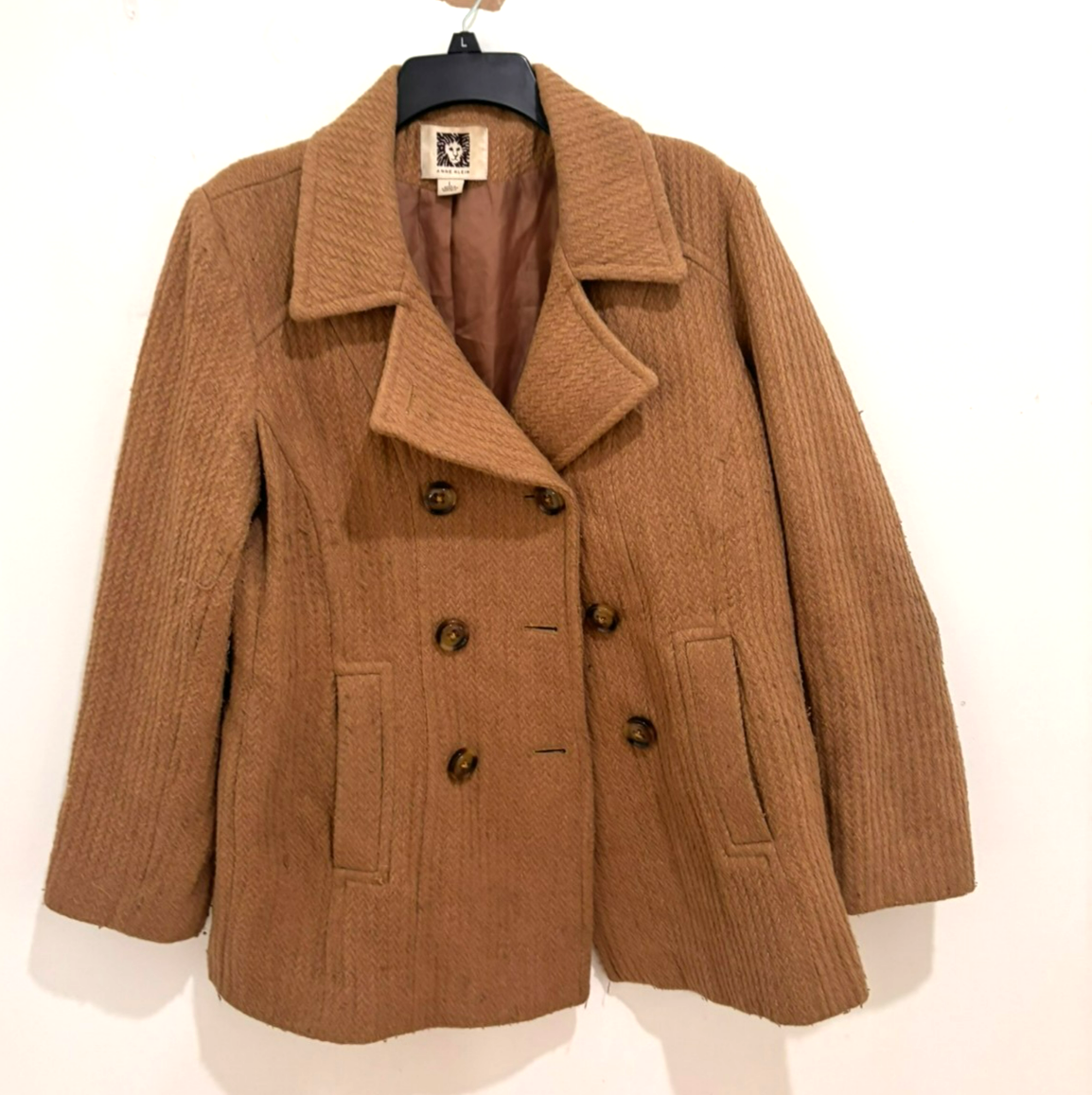 Anne Klein Camel Pea Coat Size Large Double Breasted Warm Winter Coat
