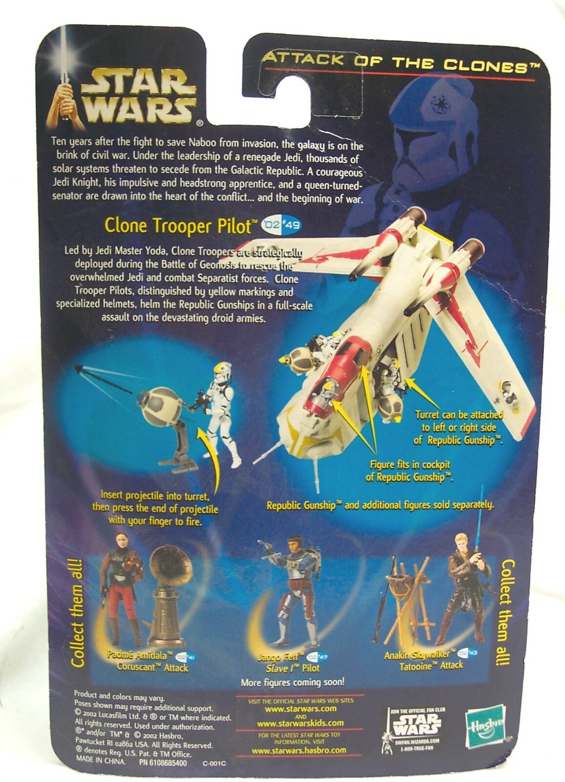 This is a Vintage Star Wars Episode 2 Attack Of The Clones Clone Trooper Republic Gunship Pilot With Firing Turret Action Figure Toy from 2002. Made by Hasbro. It is NEW in the package. It is 4" tall. Ages 4+ Combine auctions to save on shipping. ELAG
