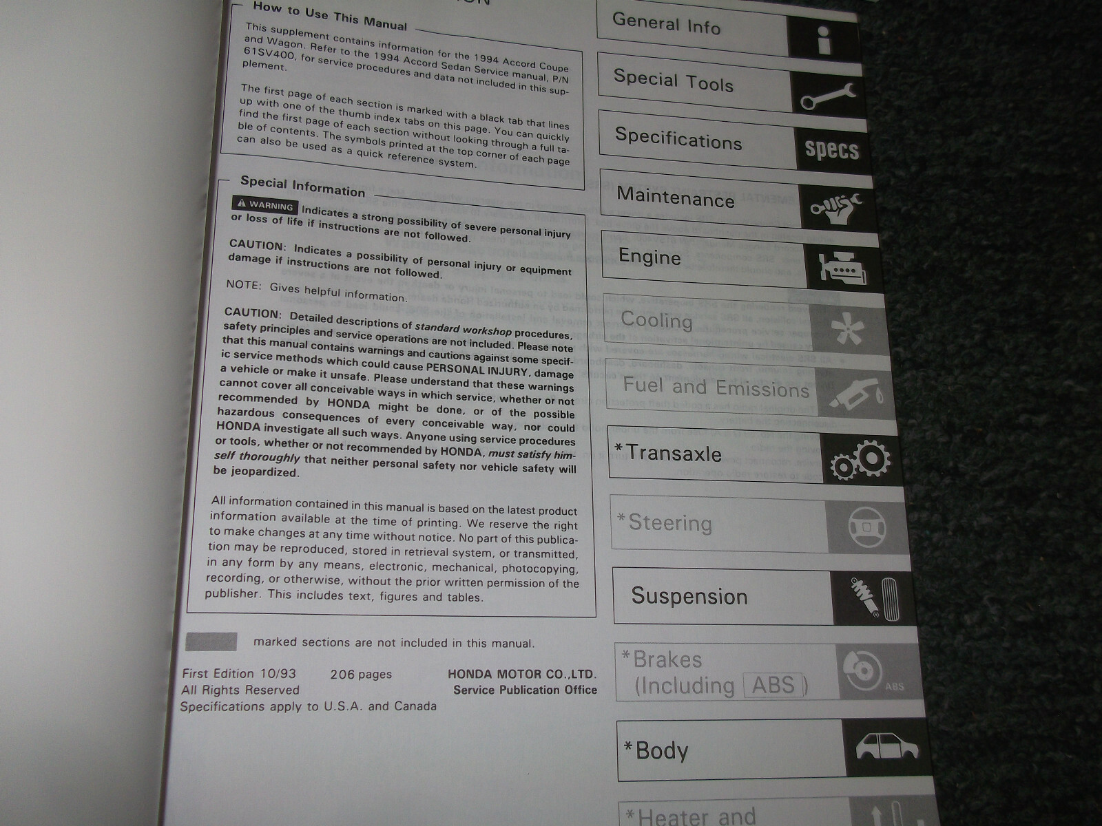 1994 Manuale di servizio di fabbrica Honda Accord, Manuale di risoluzione dei problemi elettrici, Manuale per la riparazione del corpo e Supplemento manuale di servizio