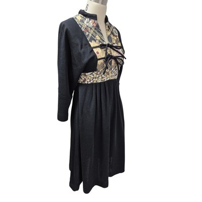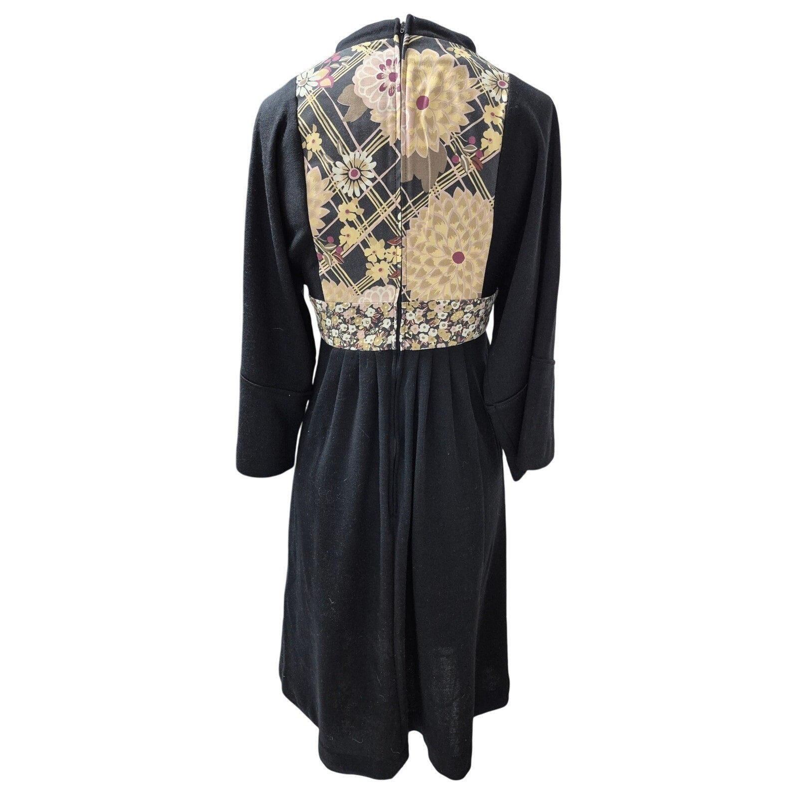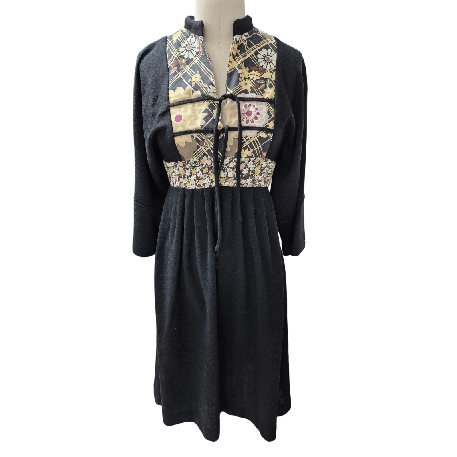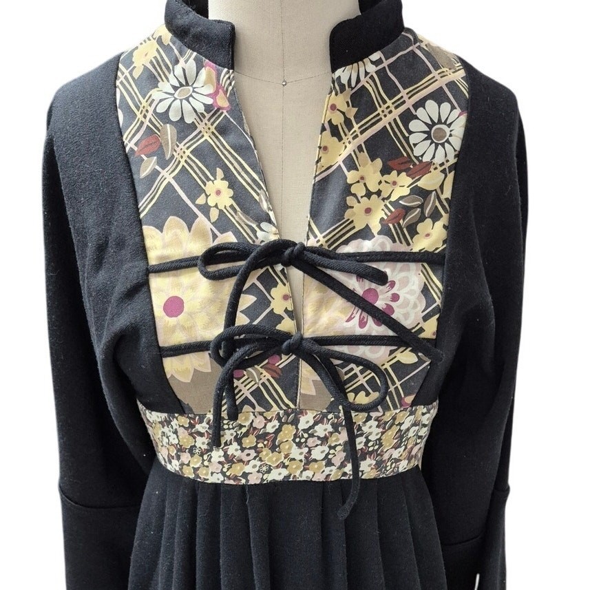 Vtg 70s The Kollection Ltd ( Saks Fifth Ave) Black Dress Floral Tie Front Top Sz 6- full skirt, back zipper, as found, no flaws. I love the contrasting cotton floral yoke on the front! The material is likely a poly knit that feels like fine wool- but the tag says it is machine washable, so it is not wool.