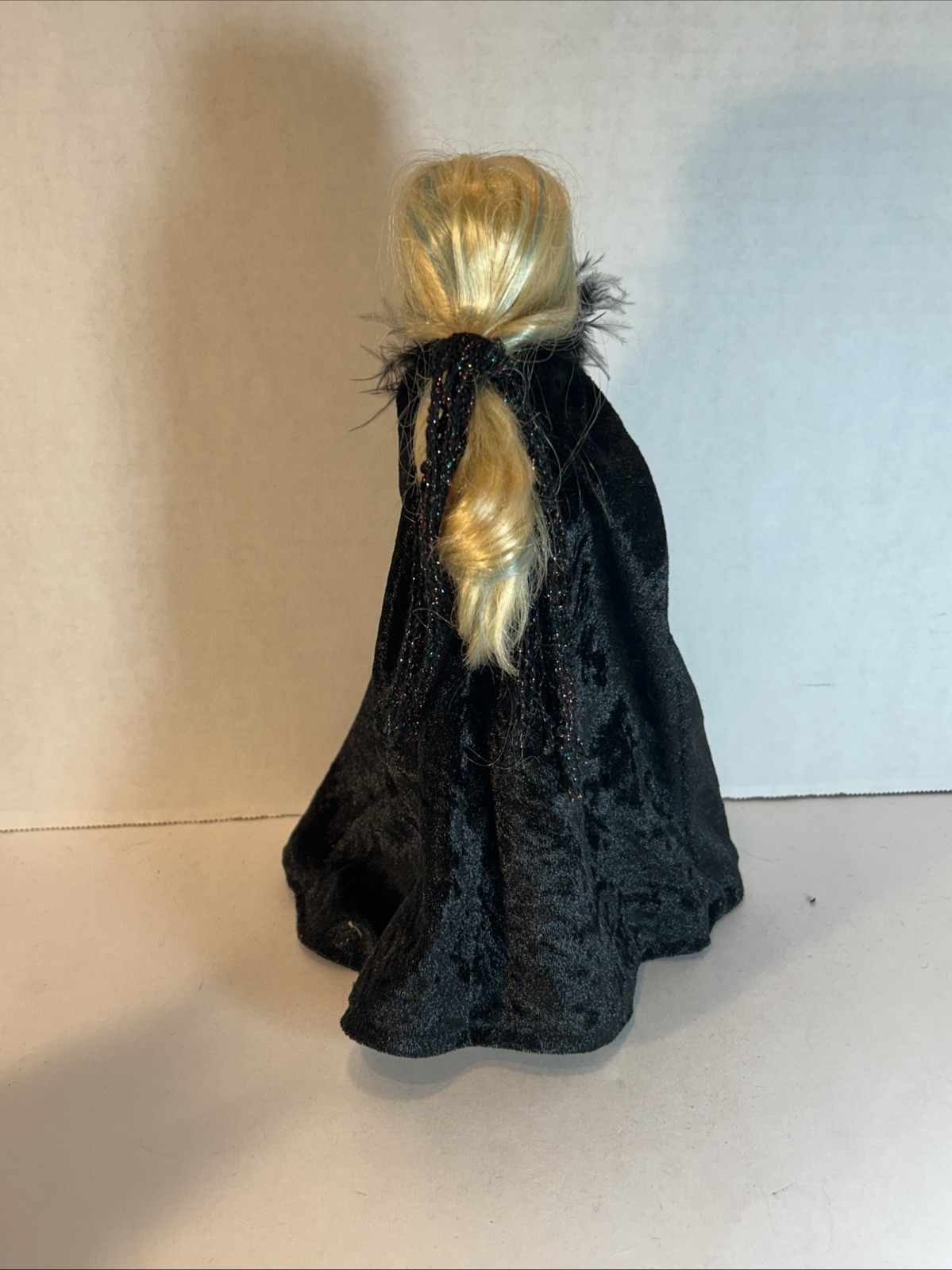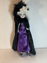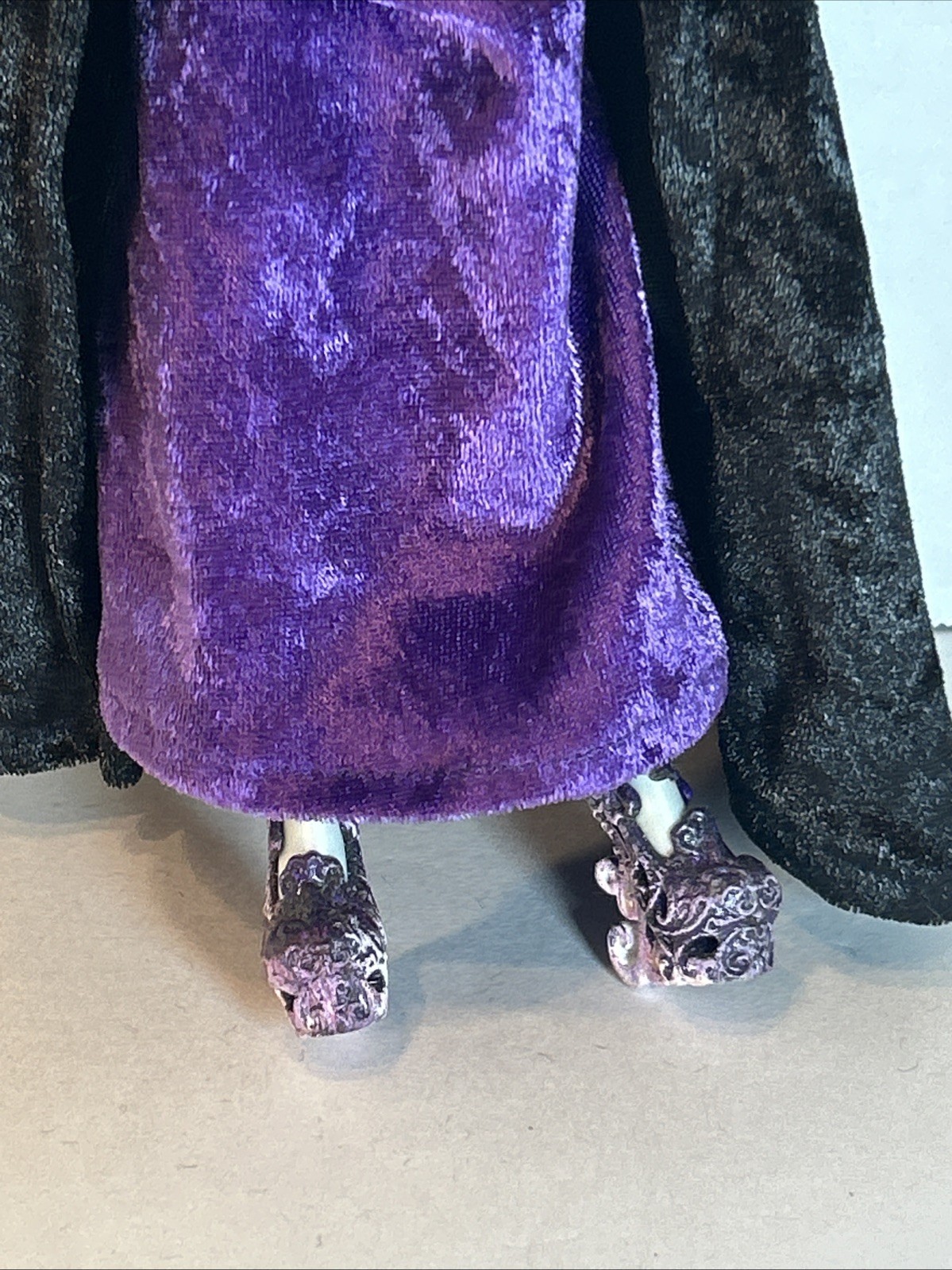 This one-of-a-kind custom repaint Monster High doll features striking Gothic and Victorian influences. She wears a hand-stitched purple velvet gown with detailed floral embroidery, black cloak, and a feathered top hat for a dramatic and elegant aesthetic. Her repaint work is professionally done with expressive facial detailing and platinum blonde hair. Note: the doll's knee joints no longer support upright posing unaided?she includes a stand for display.