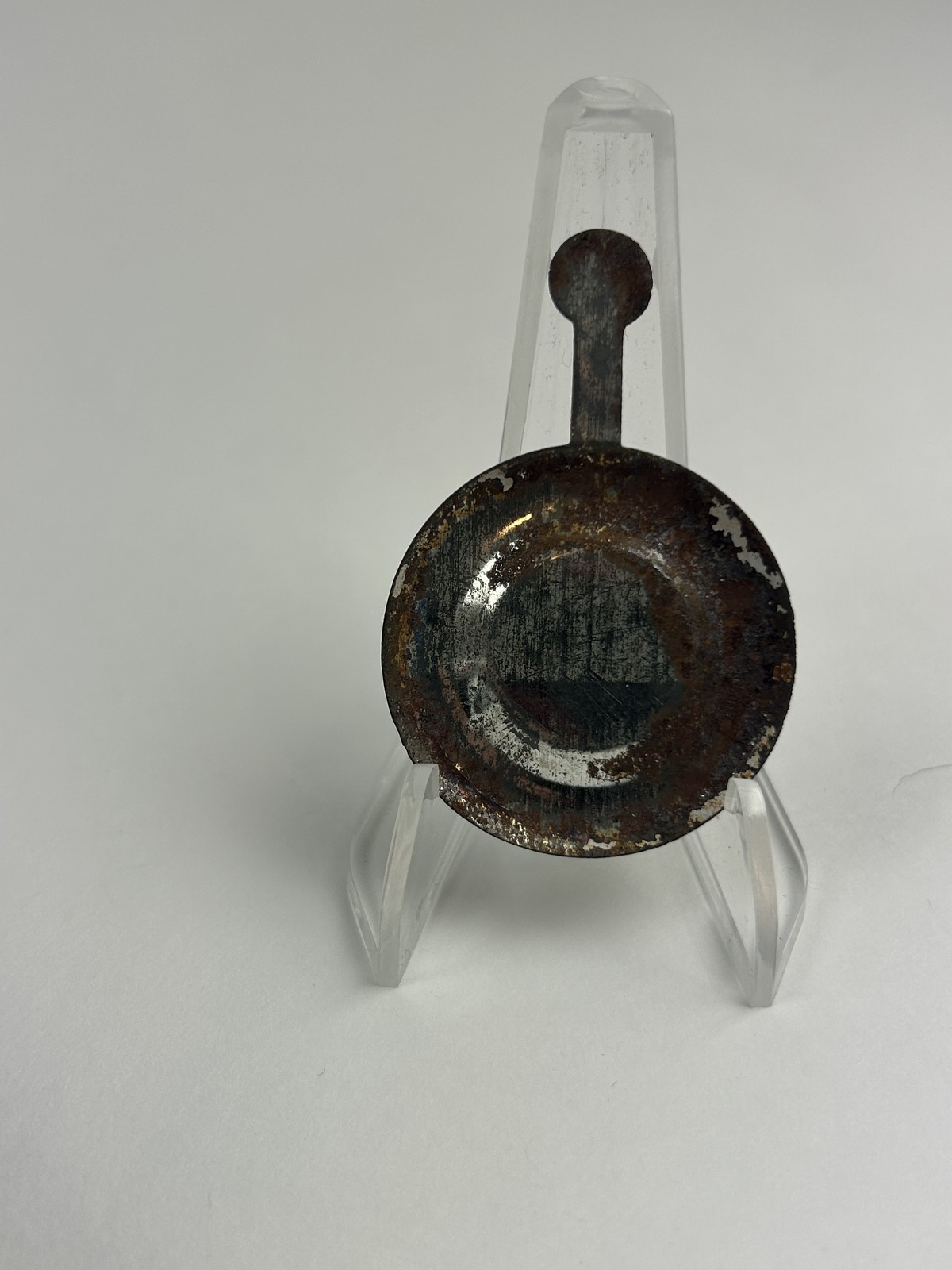 Condition: Excellent overall vintage condition. Car shows minor paint wear, small scratches, and some wear to decals consistent with age. Button has significant rusting and discoloration on the back and the tab area, as shown in photos.