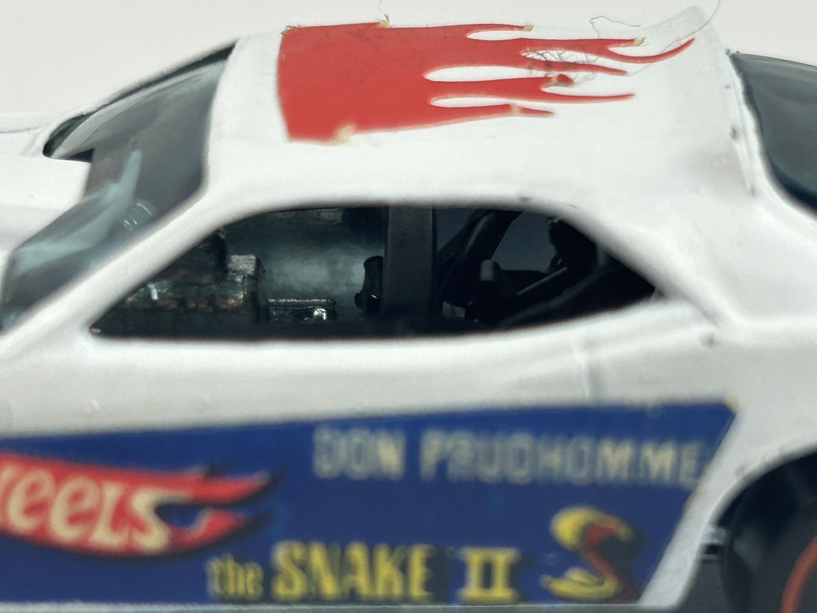 Car features white body with red flame graphics, black interior, redline wheels, and blue/yellow "Don Prudhomme The Snake II" side decals.