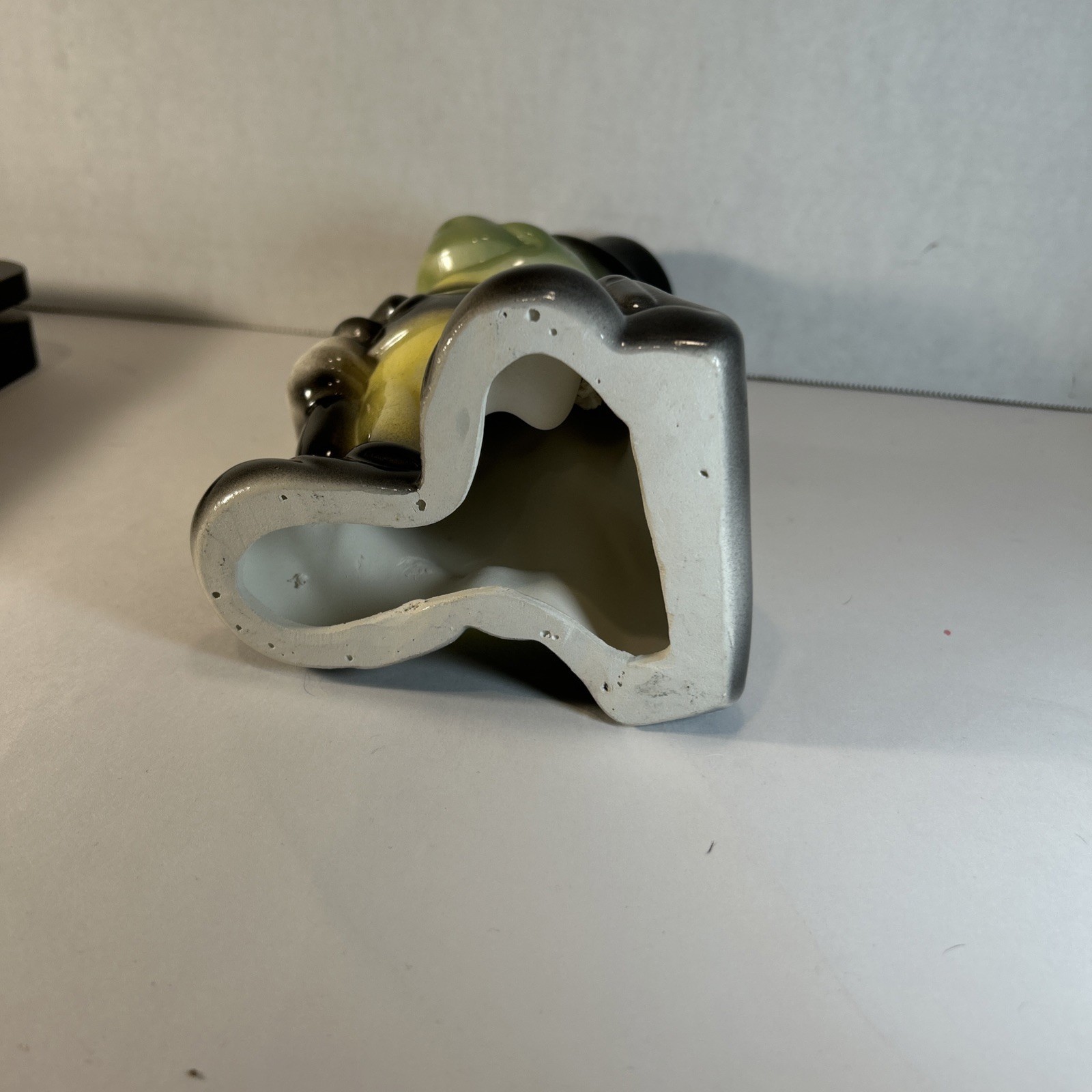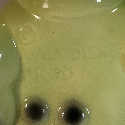 Set of two vintage Walt Disney Productions ceramic figurines featuring Jiminy Cricket and Dumbo. Jiminy Cricket is dressed in a black top hat with a briefcase, while Dumbo wears a circus-style collar and blue hat. Both figurines are hand-painted with classic mid-century styling. Stamped Walt Disney Prod. on the base, dating them prior to 1986. These pieces are in good vintage condition and make a wonderful addition for Disneyana collectors.