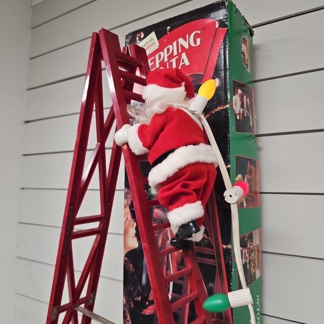 The product is a vintage 1994 Mr. Christmas Stepping Santa ladder climber that is animated and musical, featuring multicolor lights. This collectible Christmas decoration is made of mixed materials in China during the 1990s. Perfect for holiday enthusiasts looking for a nostalgic touch to their seasonal decor, this item is sure to bring joy and festive spirit to any Christmas celebration.