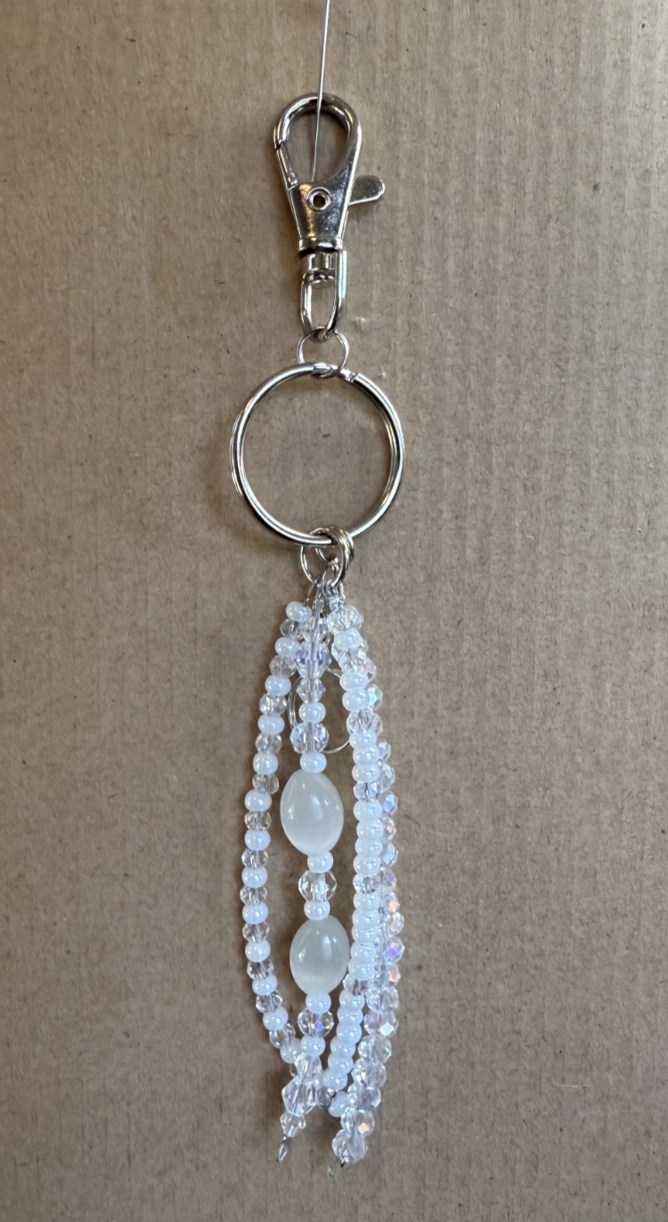 Handcrafted Keychain/Purse charm, White quartz, pearls and clear rondelle beads