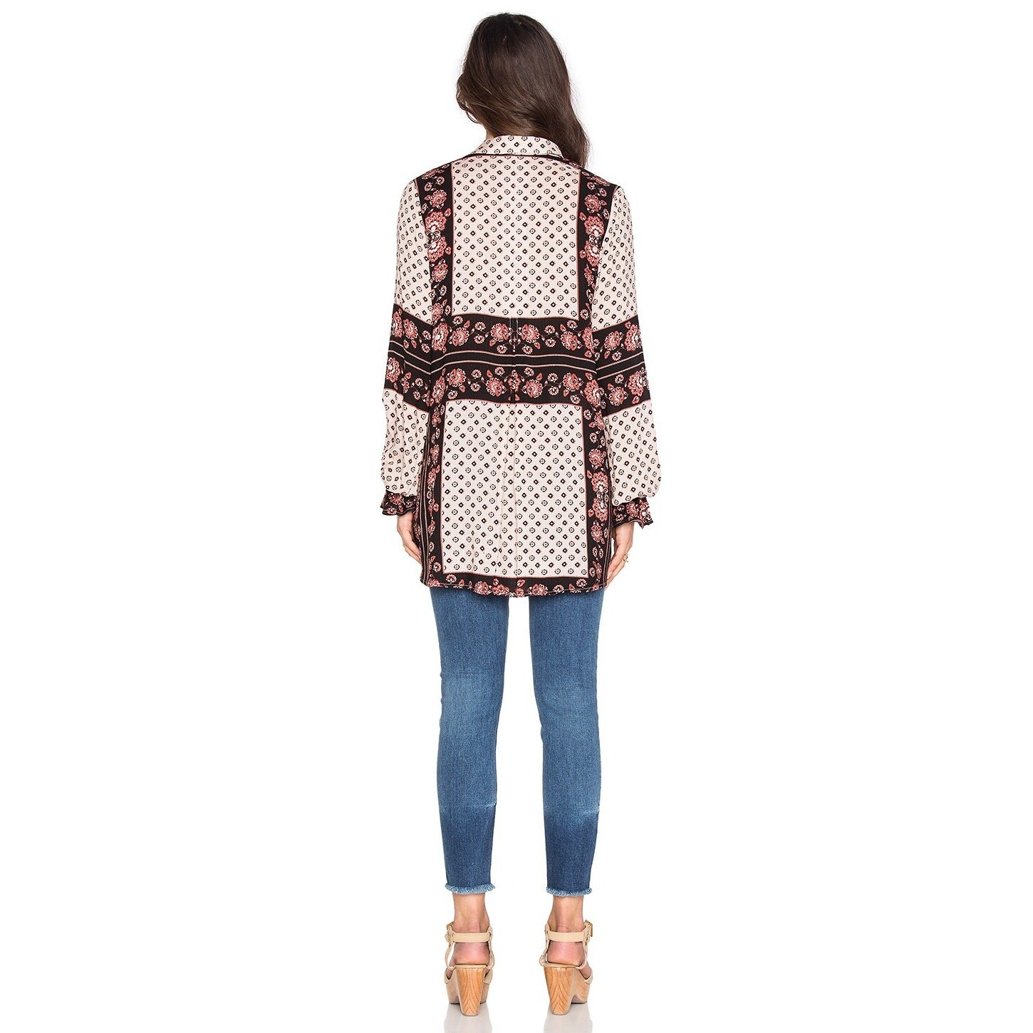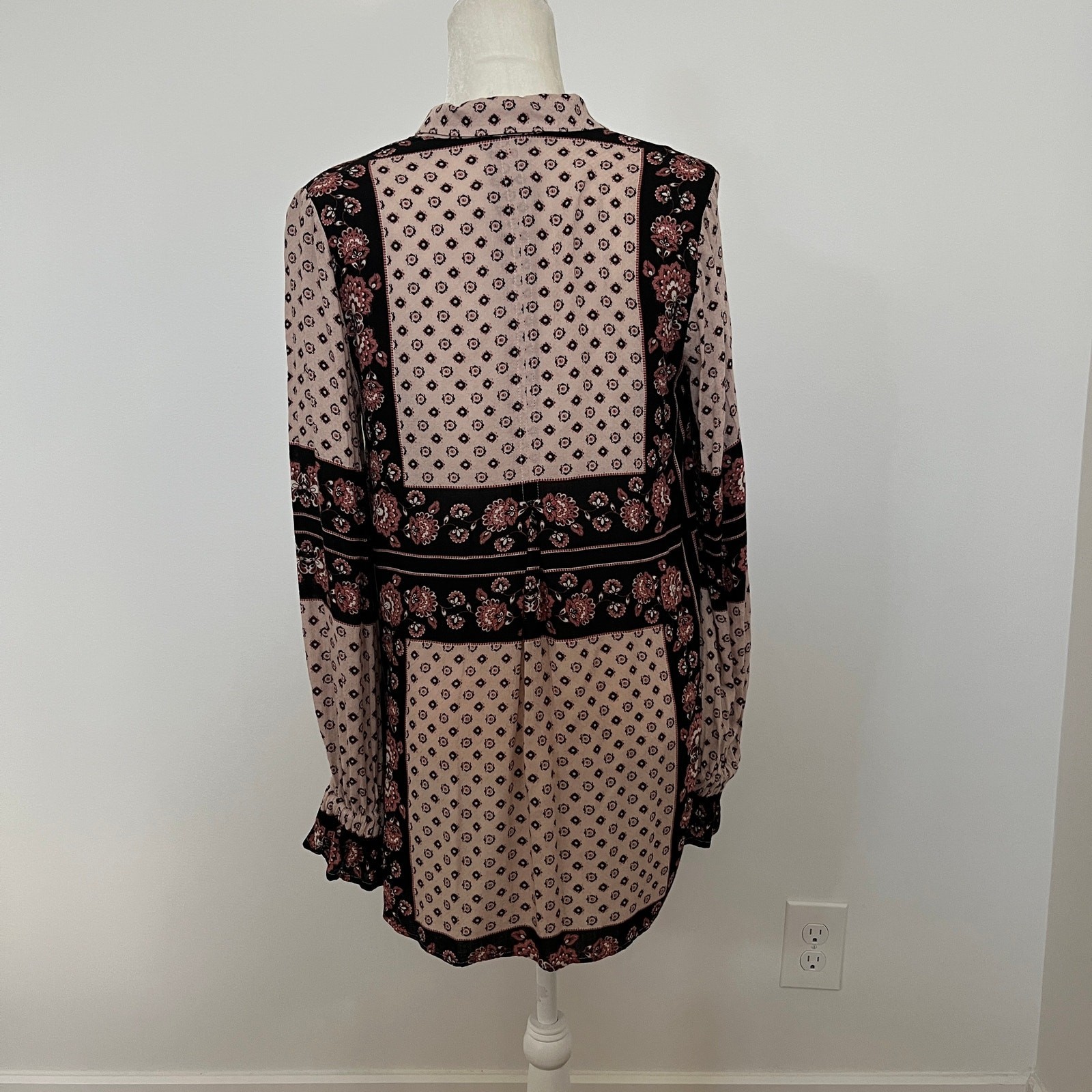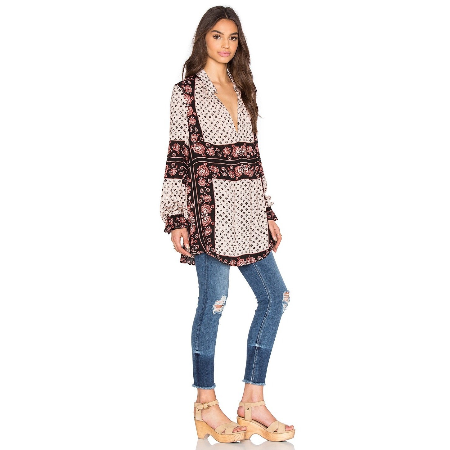 Free People Changing Times printed blouse. V-neck tunic with a relaxed fit, cinched long sleeves, and front button closure.