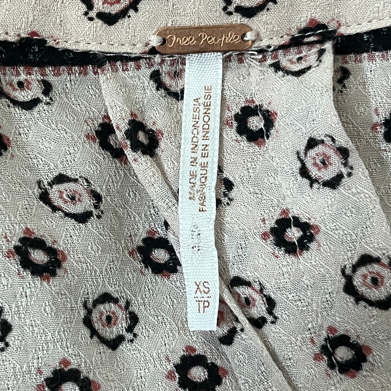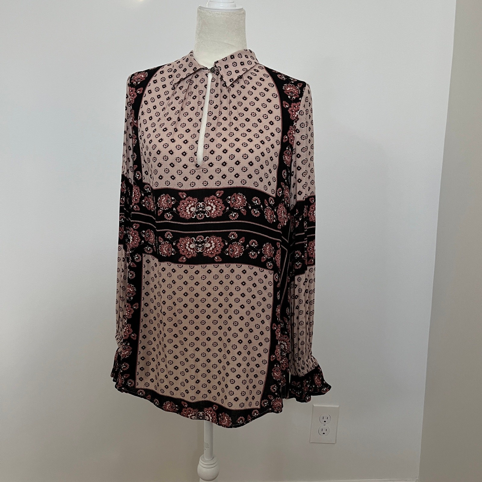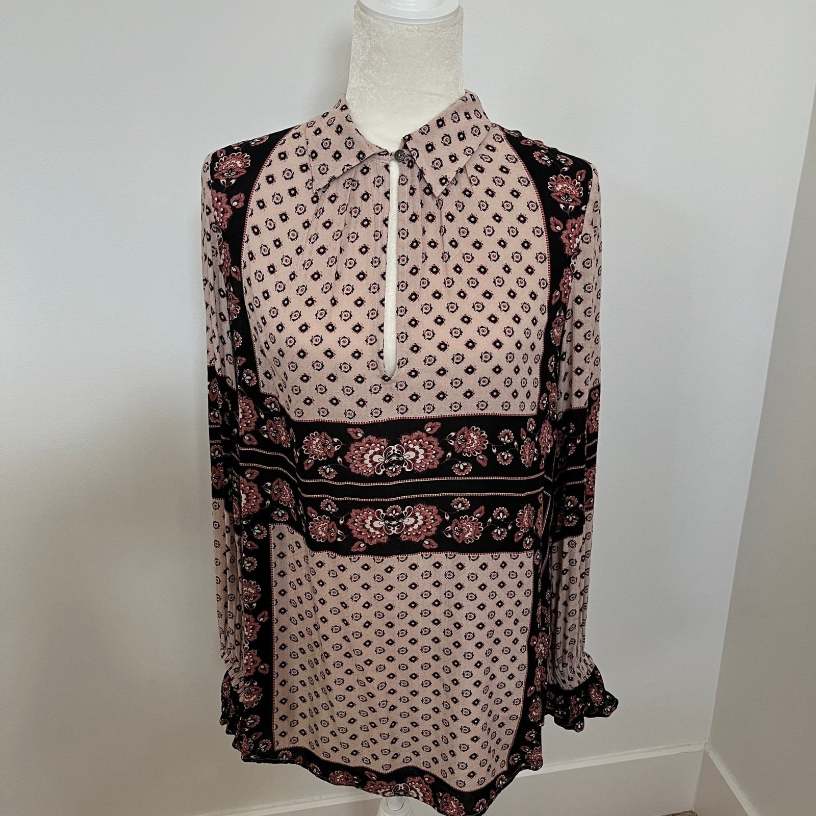 Free People Changing Times printed blouse. V-neck tunic with a relaxed fit, cinched long sleeves, and front button closure.