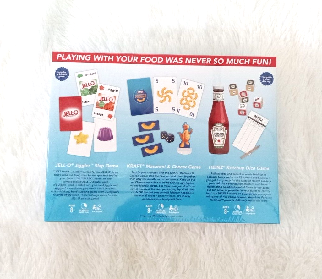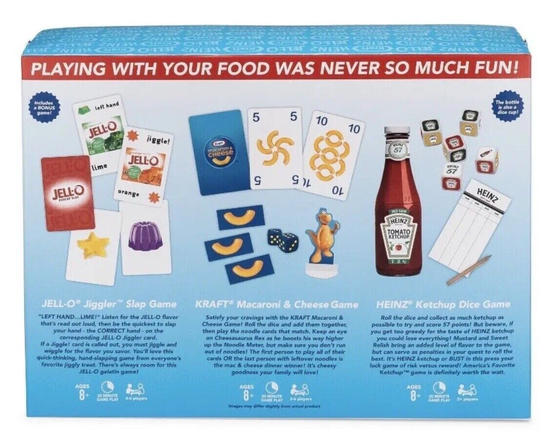 Playing with your food was never so much fun! Update your family game night recipe with this variety pack. Kraft Macaroni Cheese Game (3-4 players): Satisfy your cravings with the KRAFT Macaroni Cheese Game! Roll the dice and add them together, then play the noodle cards that match. Keep an eye on Cheesasaurus Rex as he boosts his way higher up the Noodle Meter, but make sure you don't run out of noodles! The first person to play all of their cards OR the last person with leftover noodles is the mac cheese dinner winner! It's cheesy goodness your family will love! HEINZ Ketchup Dice Game (2 or more players): Roll the dice and collect as much ketchup as possible to try and score 57 points! But beware, if you get too greedy for the taste of HEINZ ketchup you could lose everything! Mustard and Sweet Relish bring an added level of flavor to the game, but can serve as penalties in your quest to roll the best. It's HEINZ ketchup or BUST in this press your luck game of risk versus reward! JELL-O Jiggler Slap Game (4-6 players): Listen for the JELL-O flavor that's read out loud, then be the quickest to slap your hand - the CORRECT hand - on the corresponding JELL-O Jiggler card. If a Jiggle! card is called out, you must jiggle and wiggle for the flavor you savor. You'll love this quick-thinking, hand-slapping game from everyone's favorite jiggly treat. There's always room for this JELL-O gelatin game!