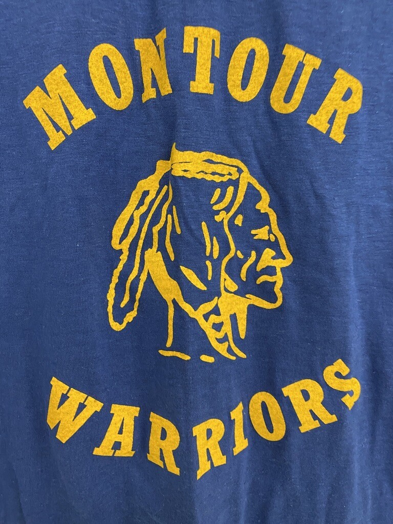vintage 80s NOS Downerwear T Shirt Montoursville Warriors Blue Yellow 50/50 L