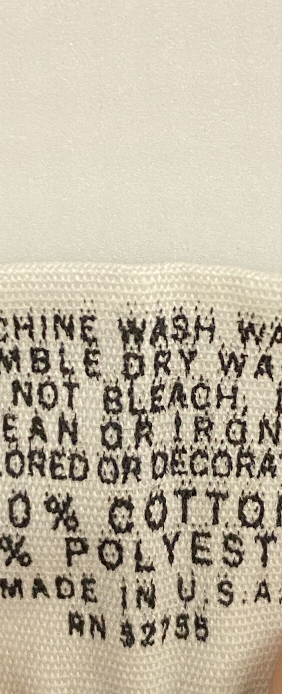Downerwear label 50-50 with single stitch sleeve hem seam.