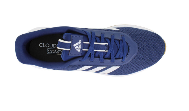 The product is a pair of adidas X_PLR Path sneakers in navy blue with white and gum accents. These men's running training gym shoes are designed with a low top style and standard shoe width, making them suitable for athletic activities.