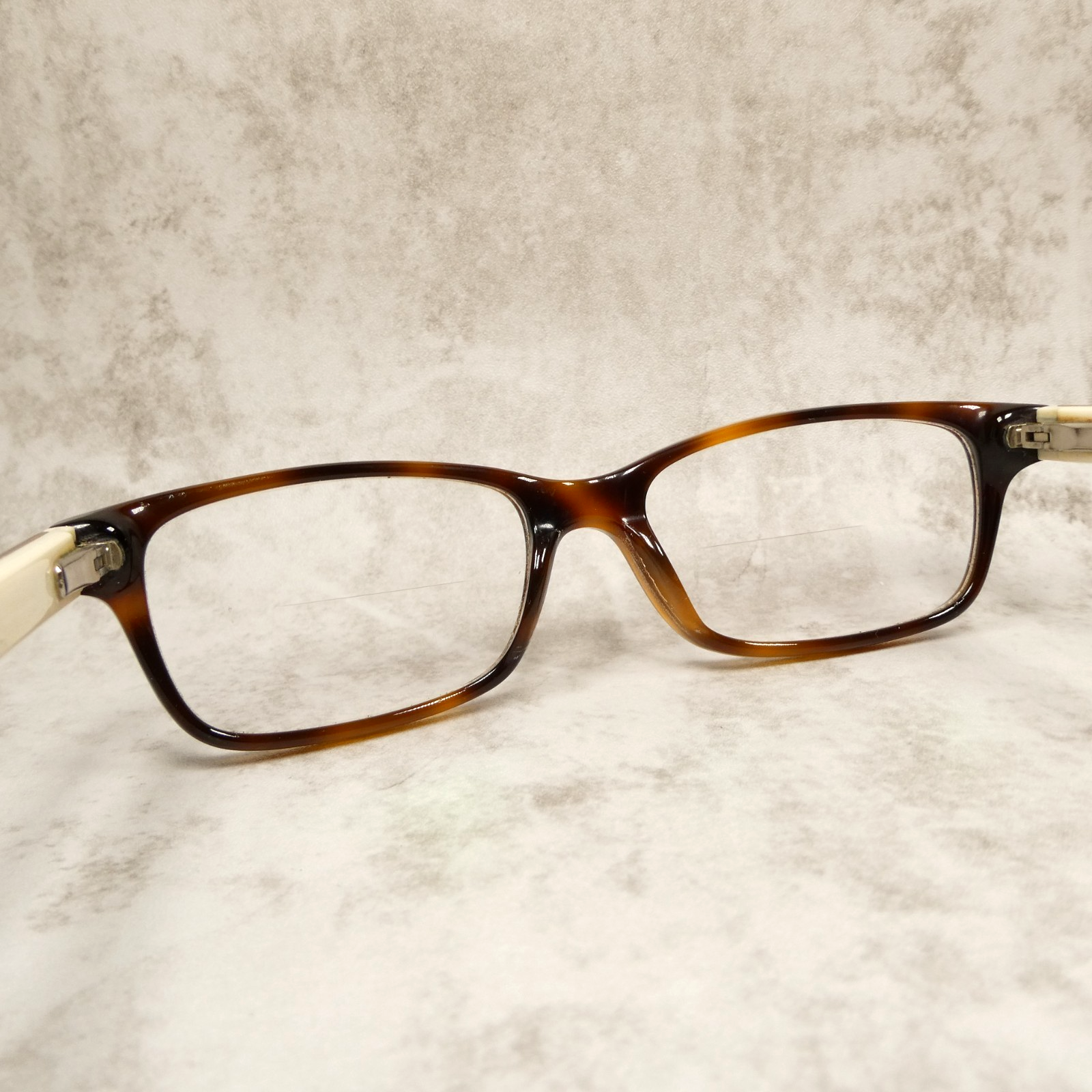 High-gloss tortoise (havana) brown acetate eyeglasses with cream colored arms.