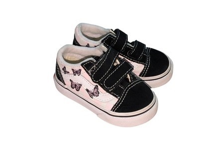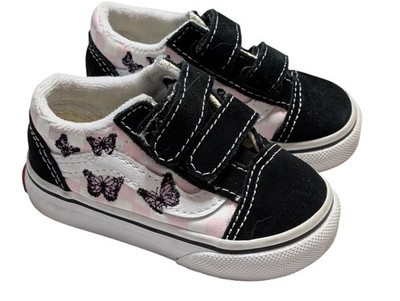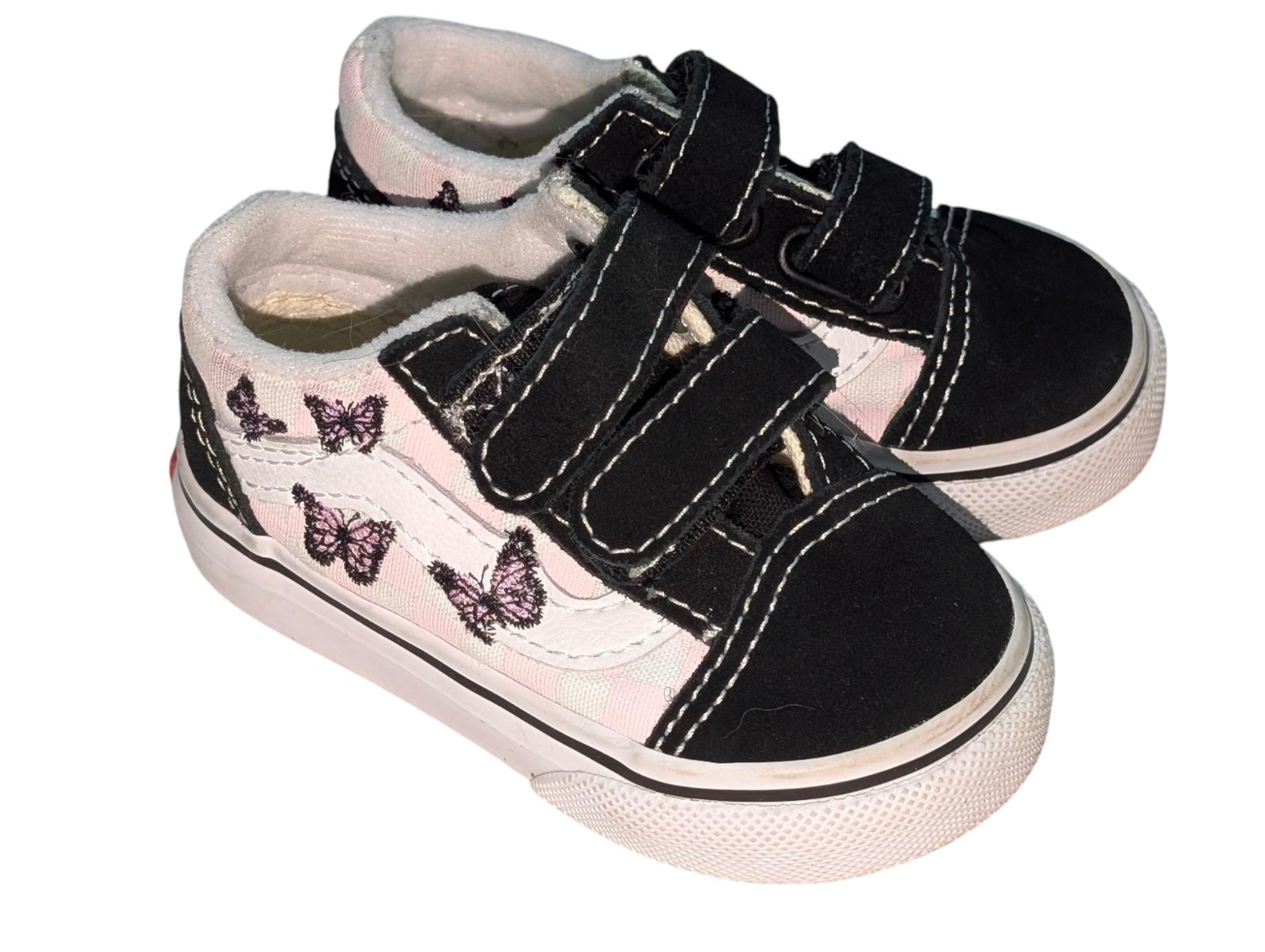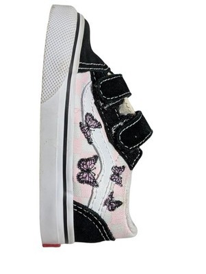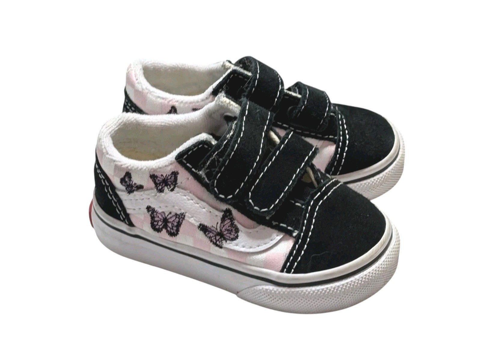 These are absolutely adorable! Toddler girls Vans athletic shoes size 4. The side is pink checkered with butterflies. These are so cute! They are in EXCELLENT