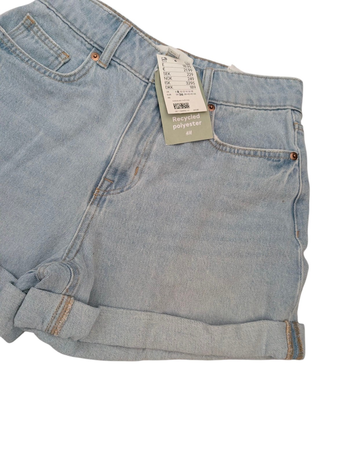 These are super cute and sexy mom shorts from h M. Brand new with tags. Light denim wash. Rolled cuff. High waist. Size 4. These are not stretchy. They are like a vintage style. Please take note of the measurements. The waste flat across unstretched measures about 13.5 in. I have a 3-in inseam and measure approximately 13.5 in from the top of the waist to the bottom of the Hem. Because they have no stretch they are fairly small for a size 4.