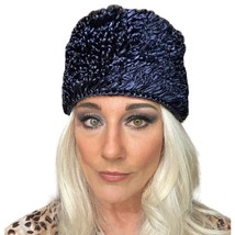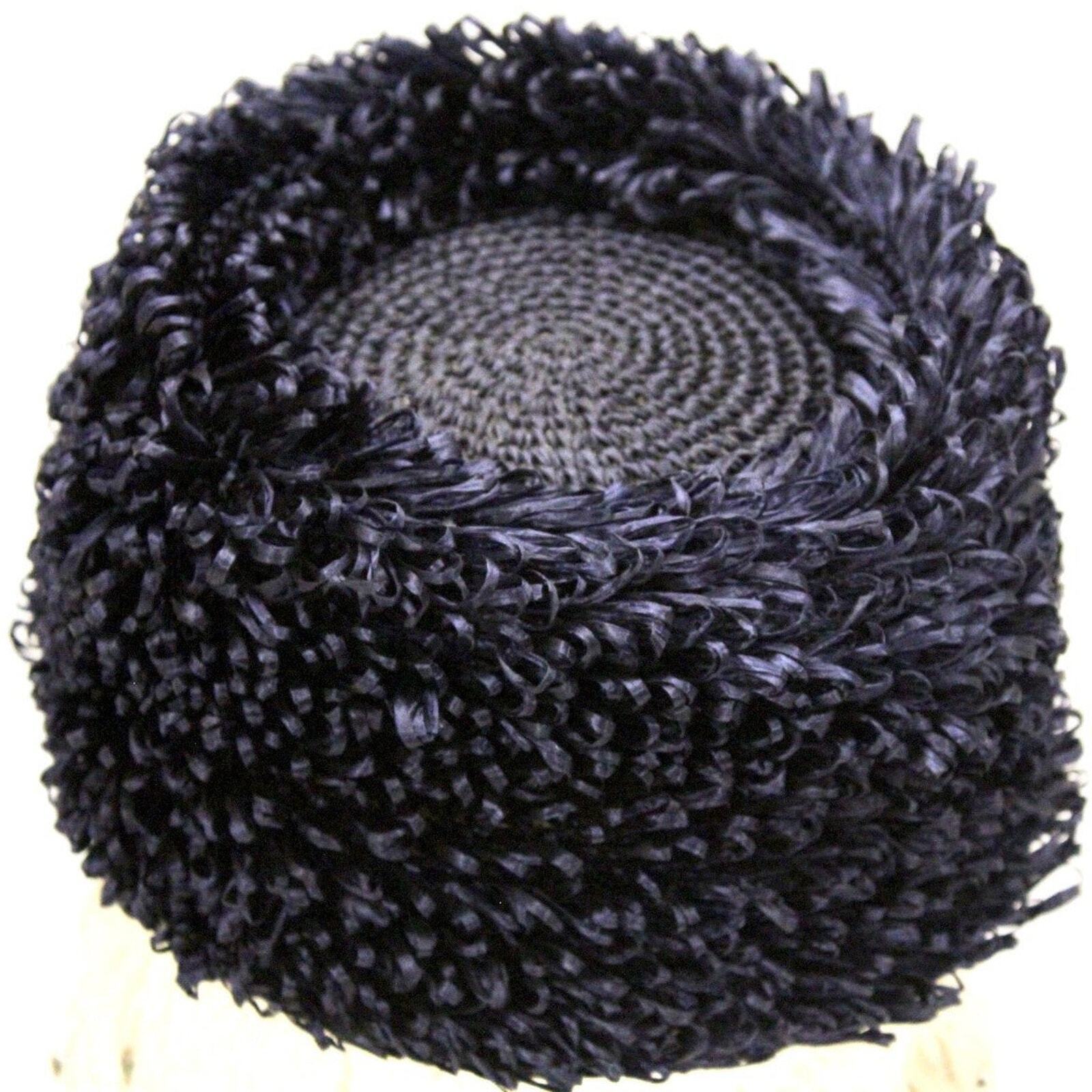 Fun vintage crocheted cellophane straw hat in dark navy blue- love the pillbox style that actually stays on your head. Will fit most head sizes as its slightly stretchy. It's almost 6" tall, thus the toque style, though still technically a pillbox.