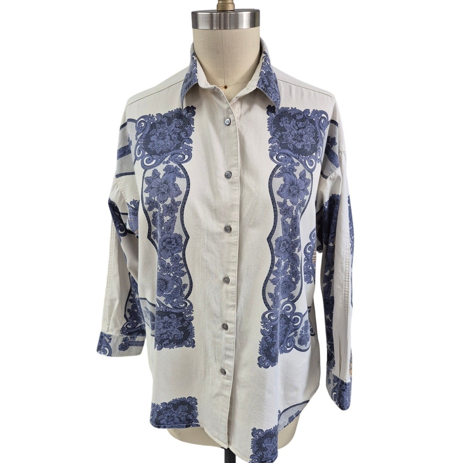 Vtg 80s NY Line Toiles de Jouy Blouse Cream/Blue Floral Border Print Cotton XL