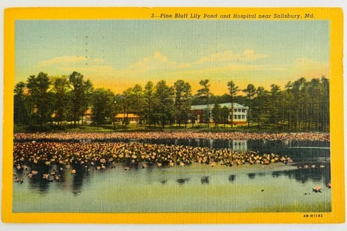 1950s Pine Bluff Lily Pond & Hospital Postcard Linen Salisbury Maryland E86RP6