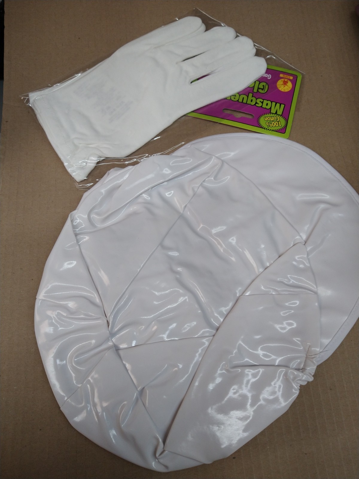 includes a pair of white gloves. Gloves are like a cotton type fabric not satin. These gloves are an accessory I added and not part of the original costume.