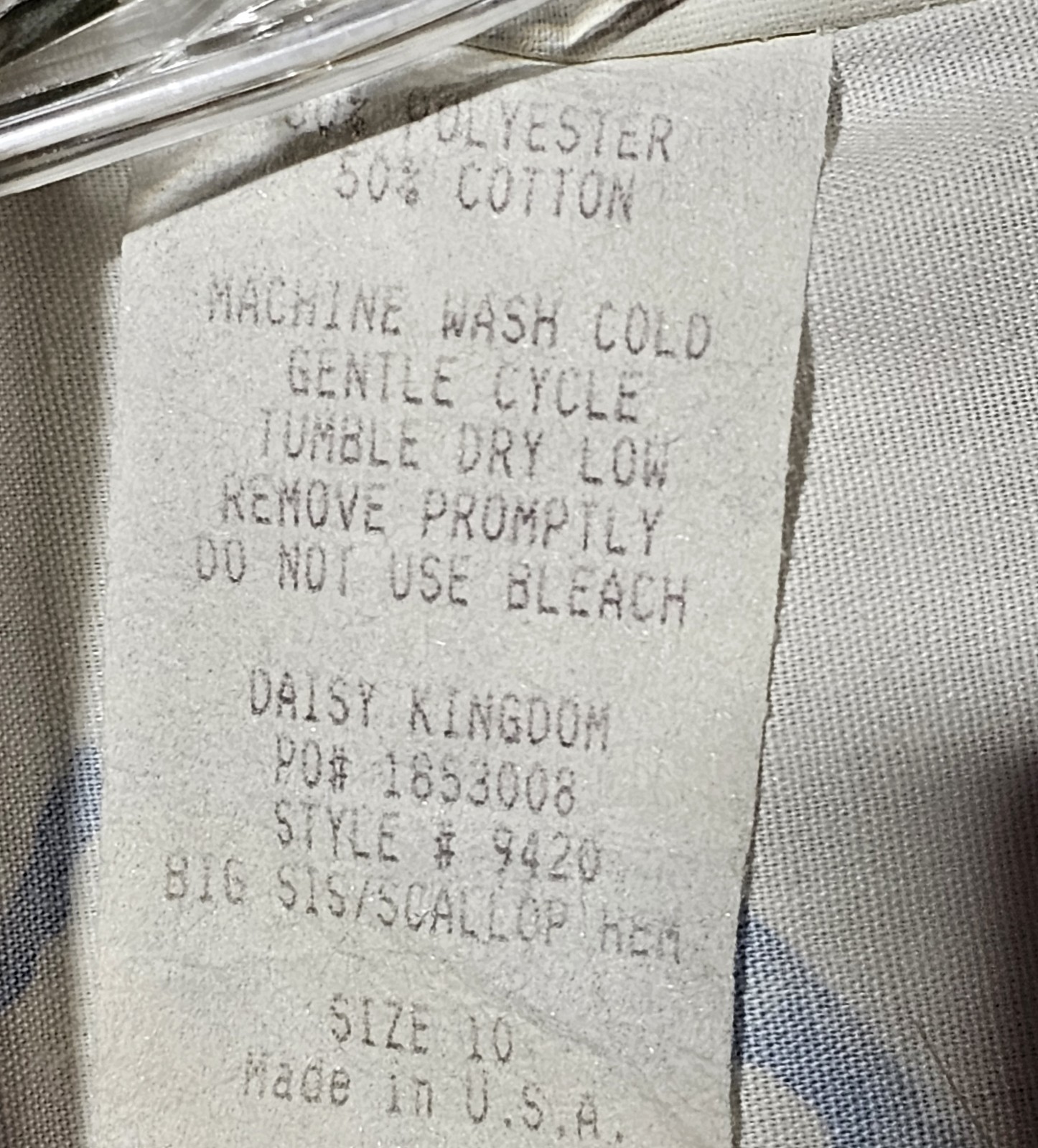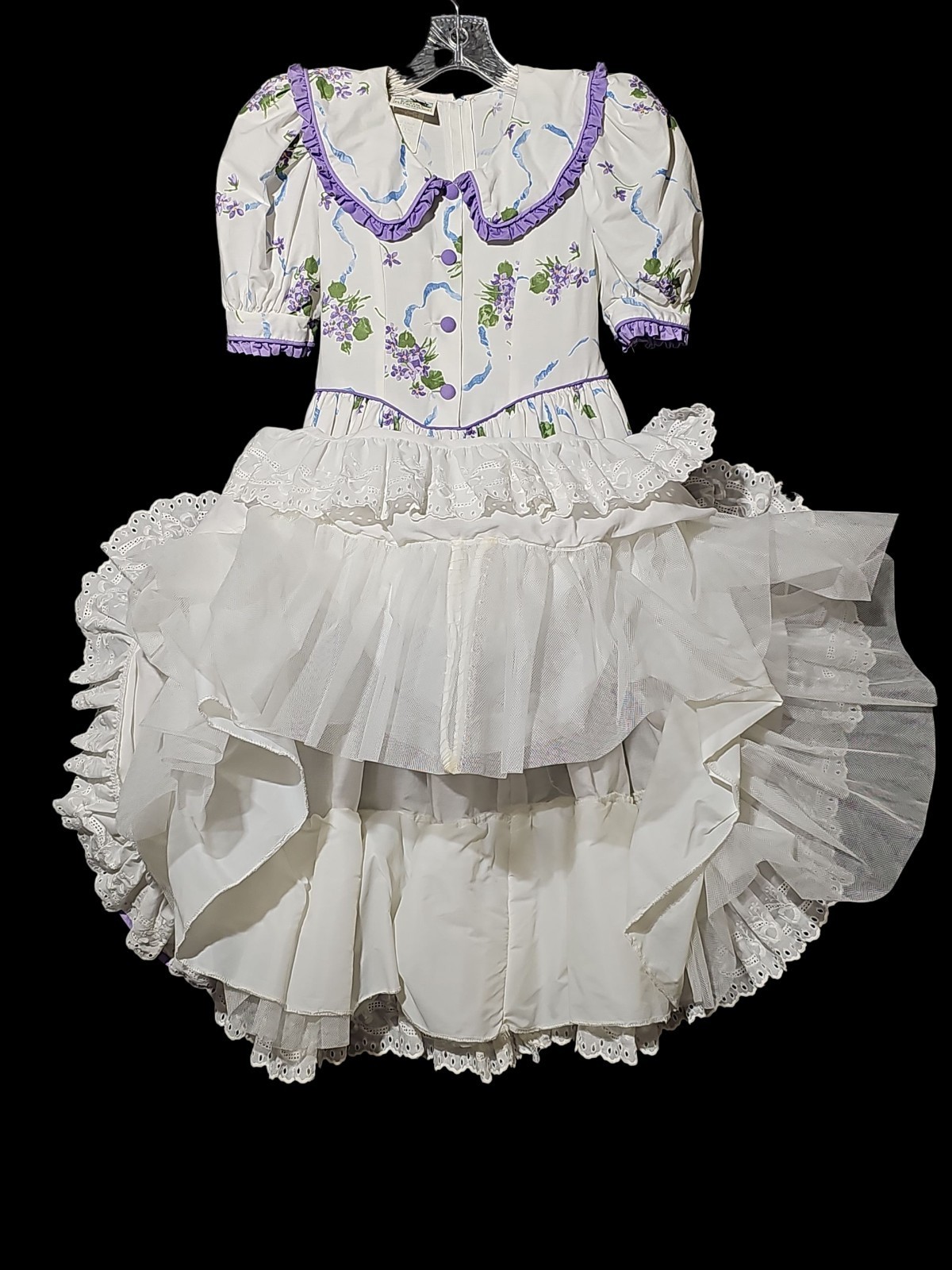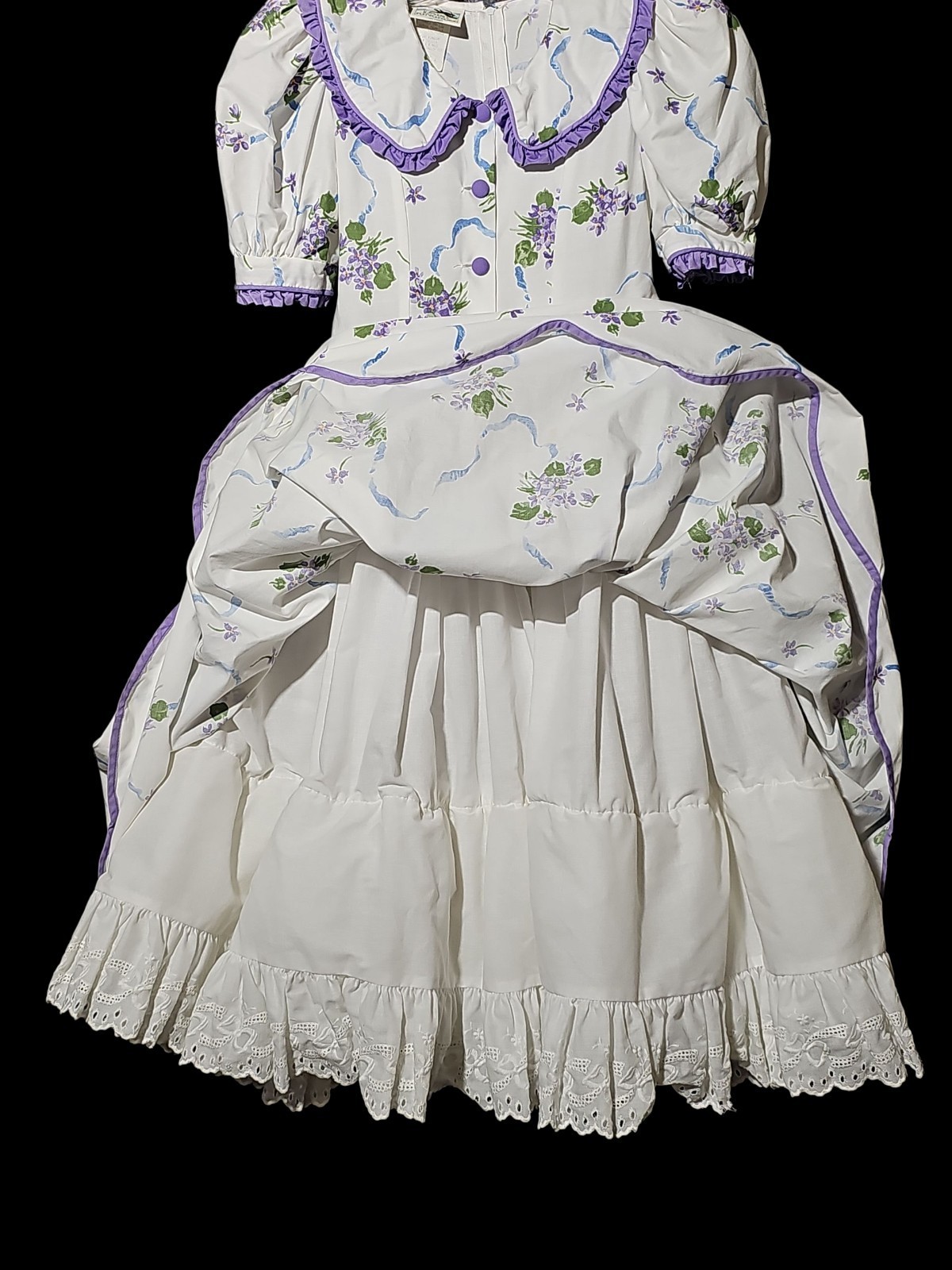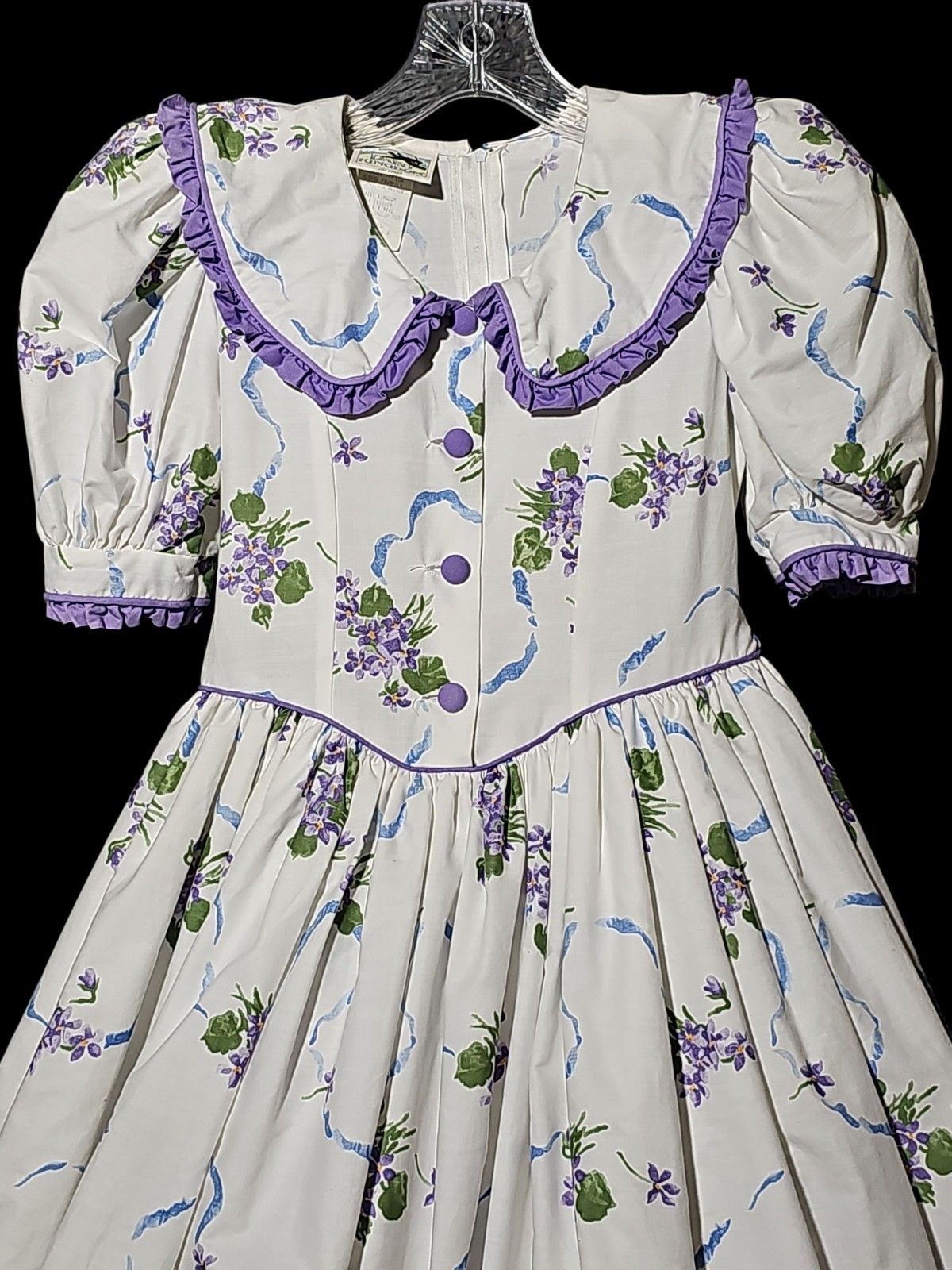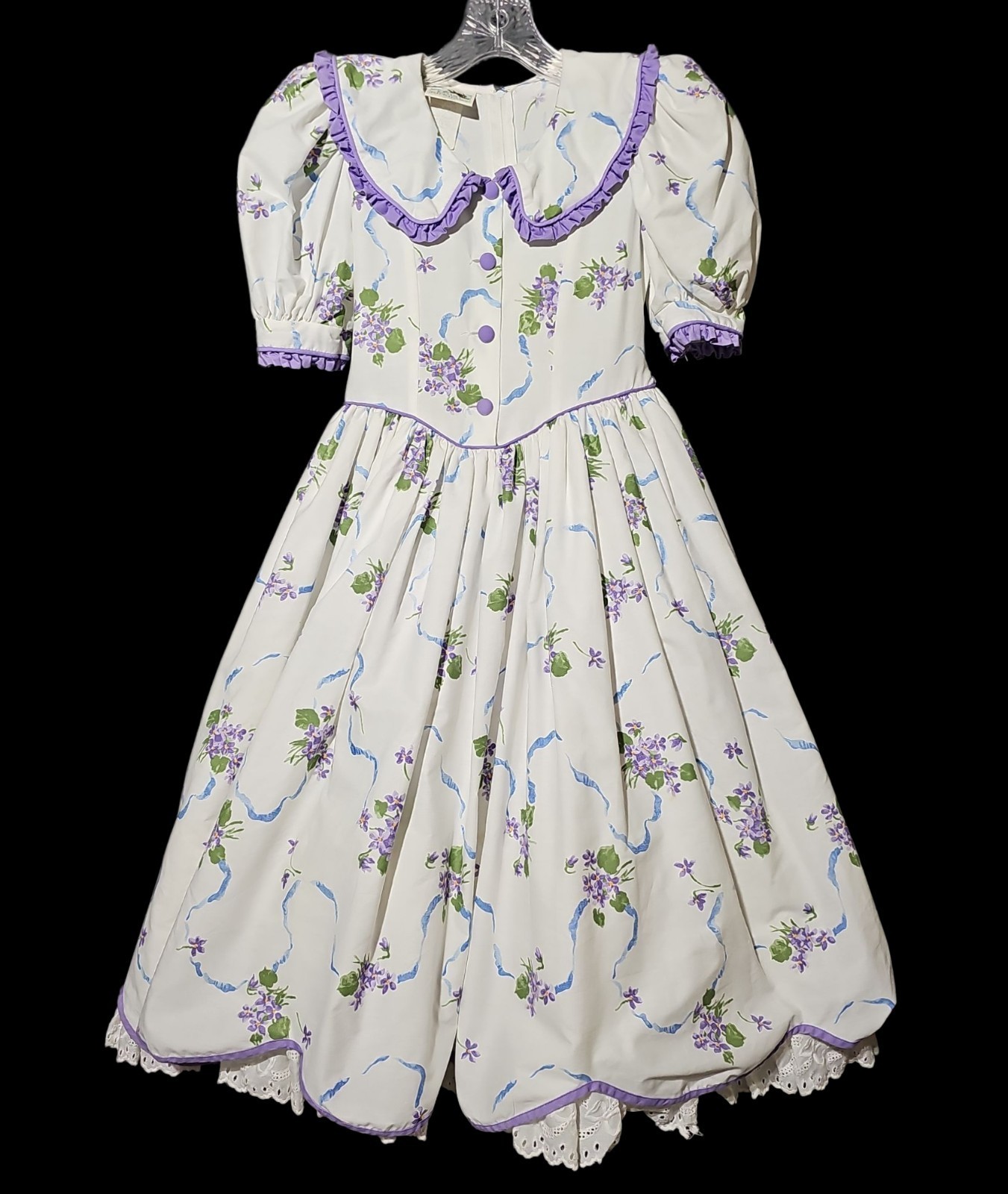 UP FOR SALE: This is a vintage Daisy Kingdom girls? party dress from the 1990s, featuring a classic purple floral print with puff sleeves, scalloped trim, and a full skirt. Made from 100% cotton with built-in crinoline for that signature Daisy Kingdom fullness.