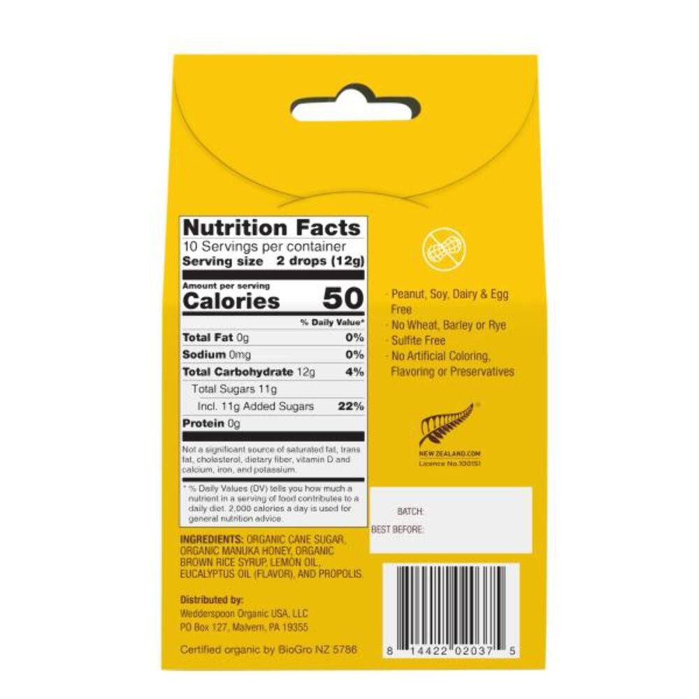 4 Packs ? ORGANIC COUGH DROPS: Wedderspoon Organic Manuka Honey with Lemon Drops include Bee Propolis which promotes immune health; Honey is excellent for dry throats, and they taste great; 20 drops ? SOOTHE YOUR THROAT WITH MANUKA: Delicious Manuka Honey Drops treat your dry, irritated throat by coating it with this time-tested recipe, still crafted with care in small batches in New Zealand ? NATURAL, CLEAN INGREDIENTS: Organic cane sugar, organic manuka honey, organic brown rice syrup, lemon oil eucalyptus oil, propolis; WARNING: Propolis can cause severe allergic reactions ? NEW ZEALAND HONEY: When you purchase Wedderspoon Honey products, be assured you are buying high-quality Organic Manuka Honey; Wedderspoon bees forage free-range-style and feast on the nectar of wild Manuka blossoms ? MADE WITH MANUKA HONEY: Manuka Honey is nature's superfood and is know for its immunity and other health and wellness benefits. Organic Manuka Honey is rare and perfect for soothing a dry, scratchy throat.