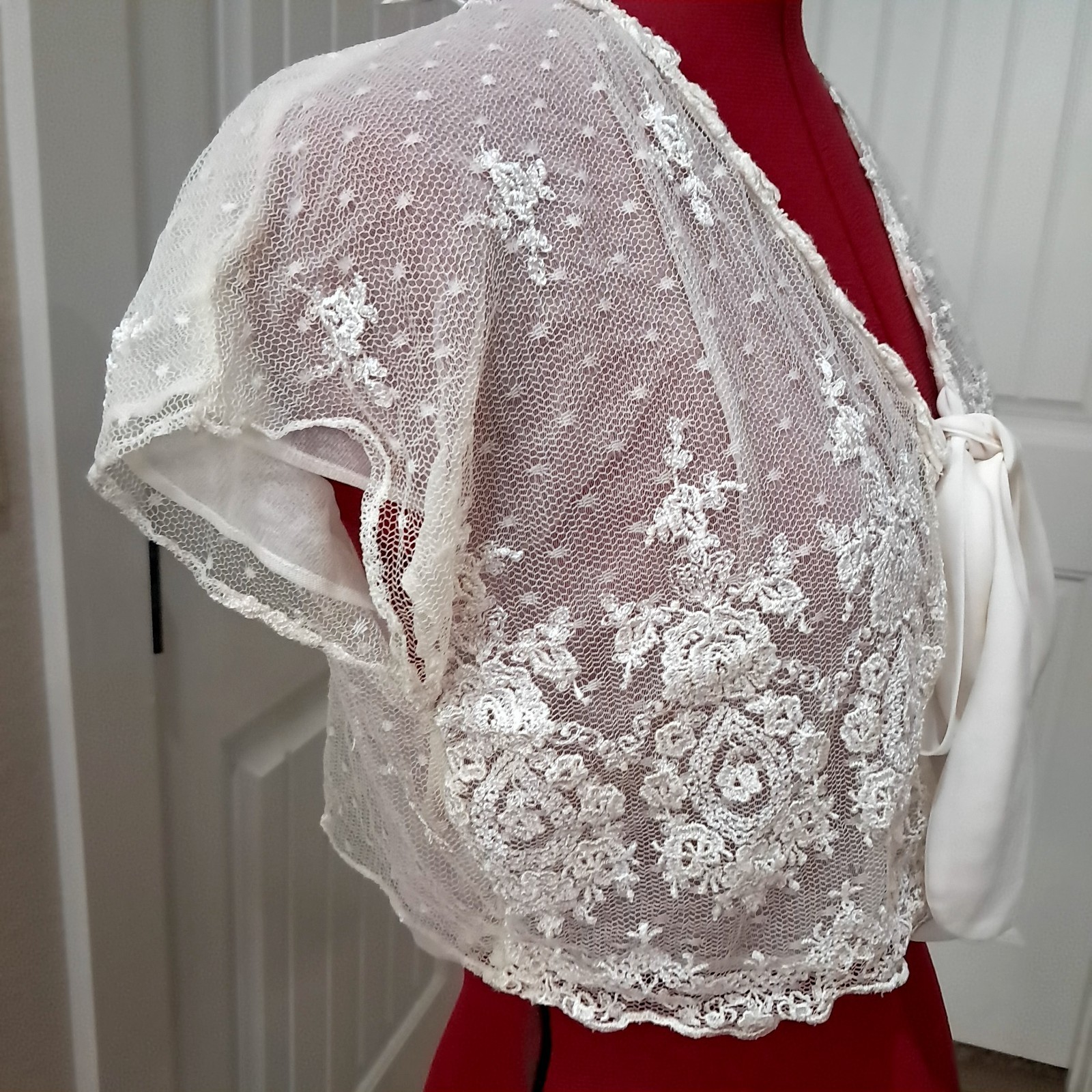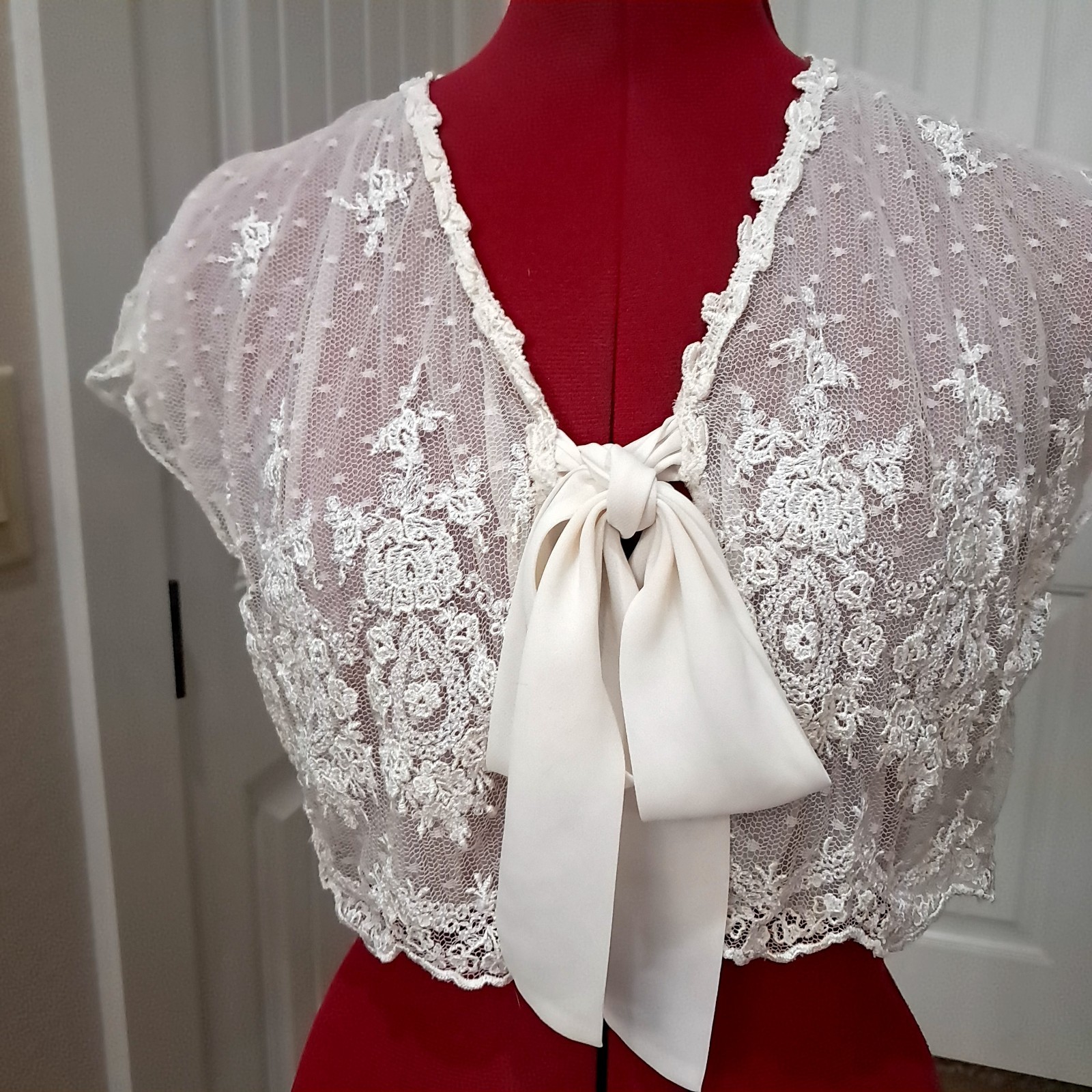 Floral lace with satin bow. Can be used over lingerie or as a shrug for day wear or formal wear. Lace with 2nd layer.