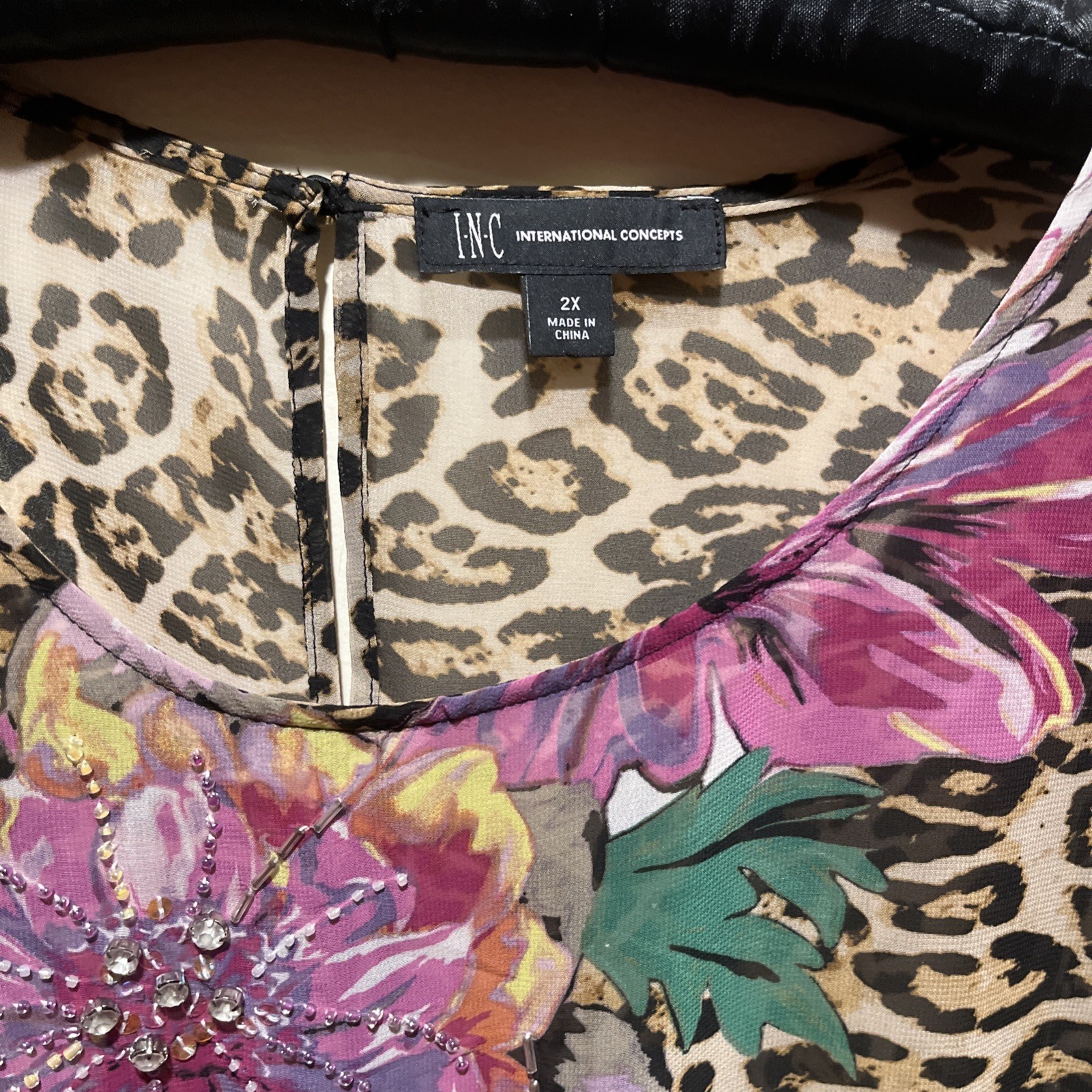 INC International Concepts 2X Leopard Floral Rhinestone Blouse Top Sheer LSleeve