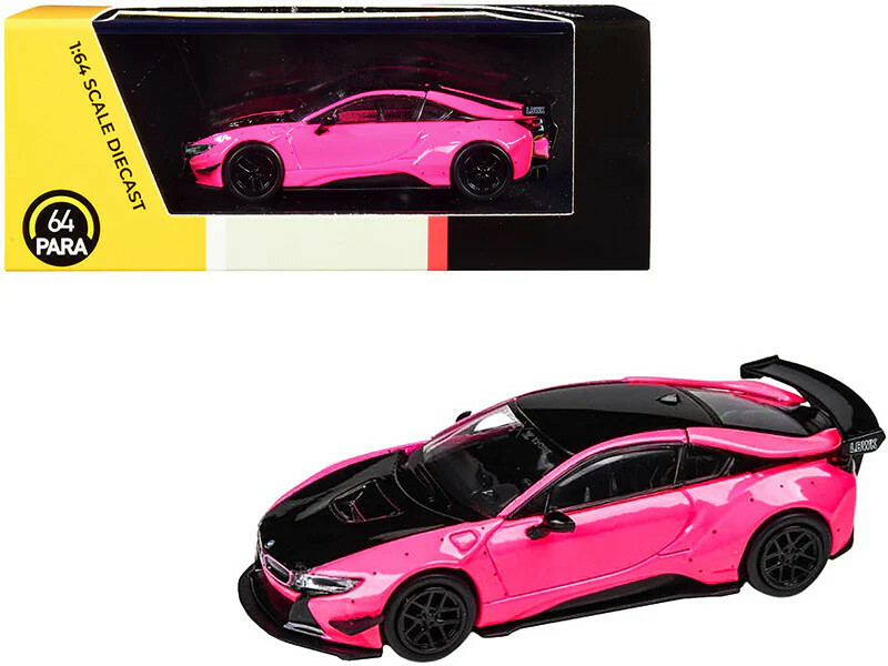 1:64 scale diecast model of the BMW i8 with Liberty Walk Hot Pink and Black finish from Paragon.