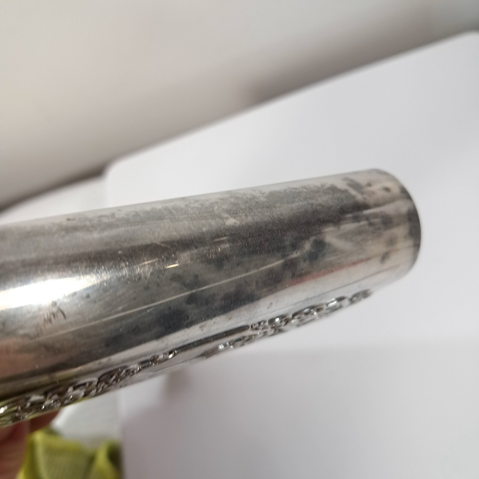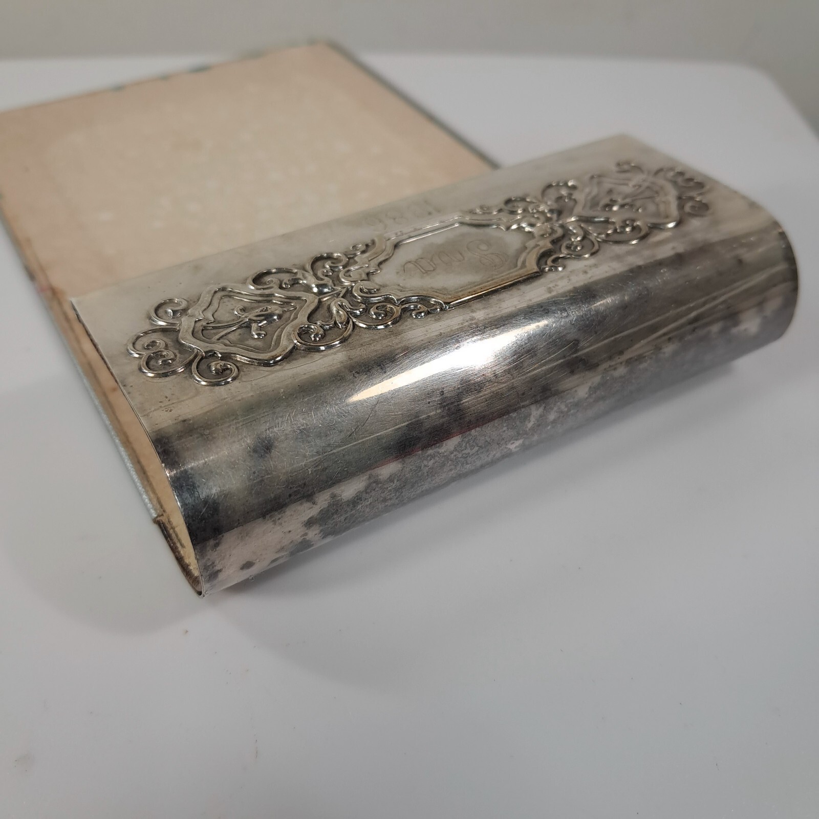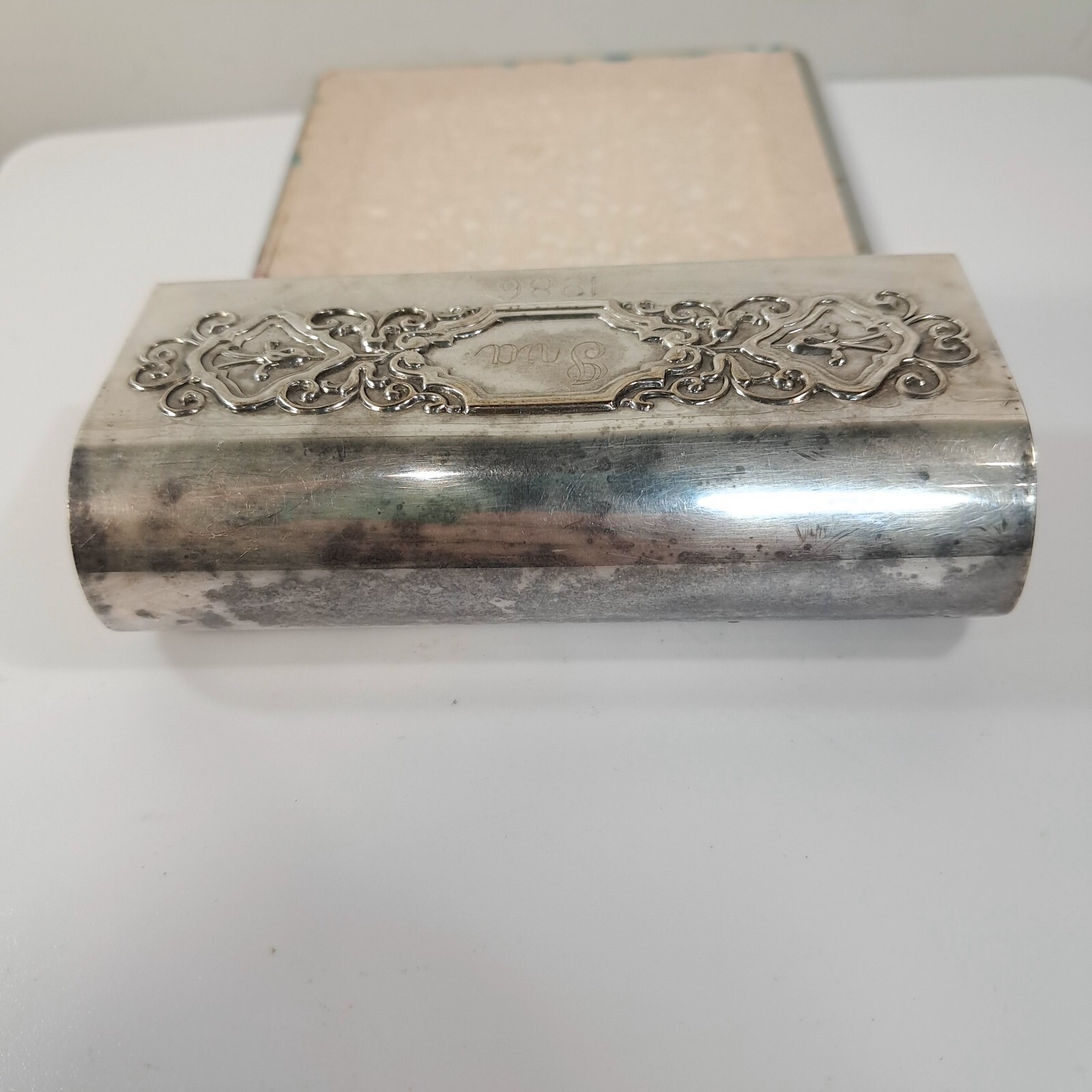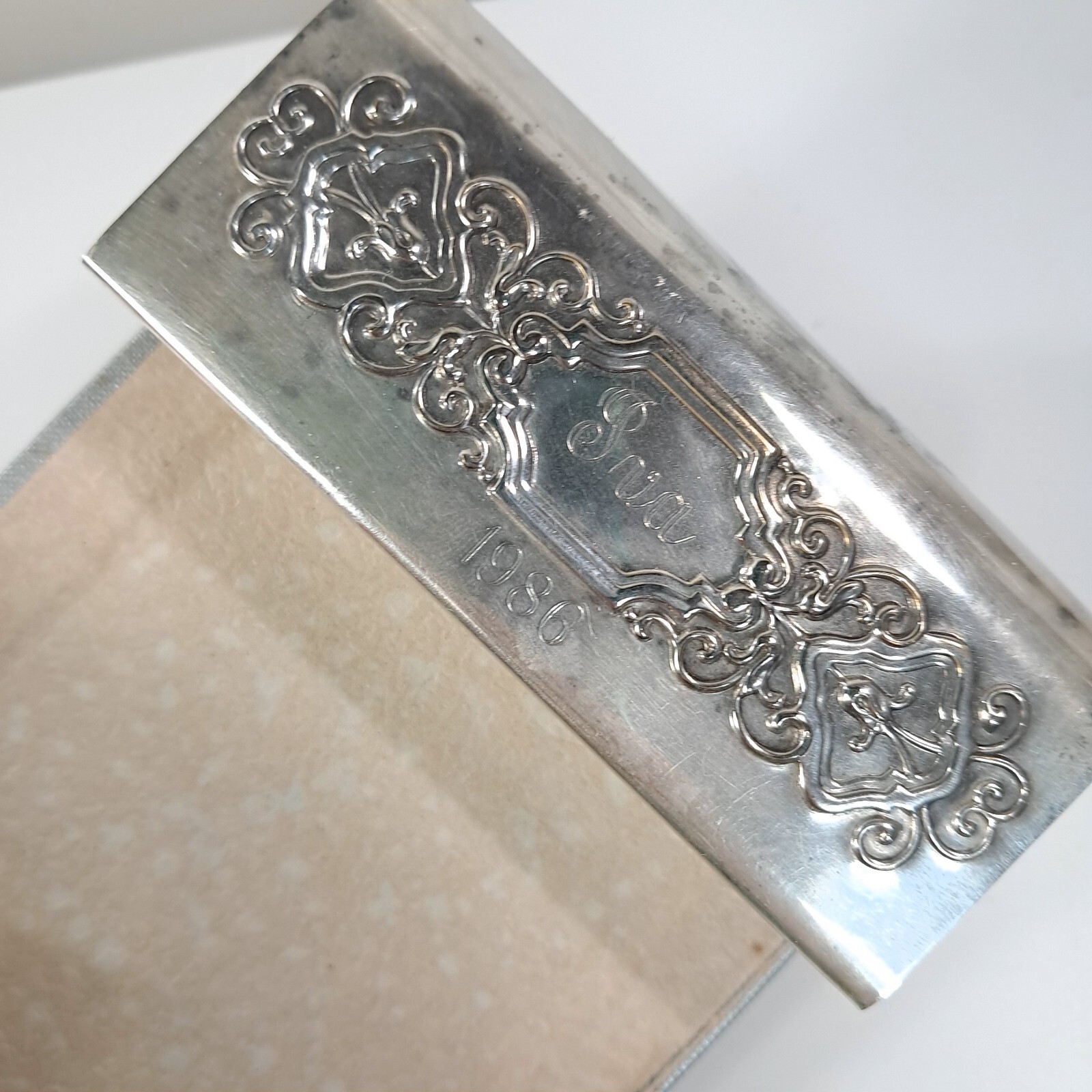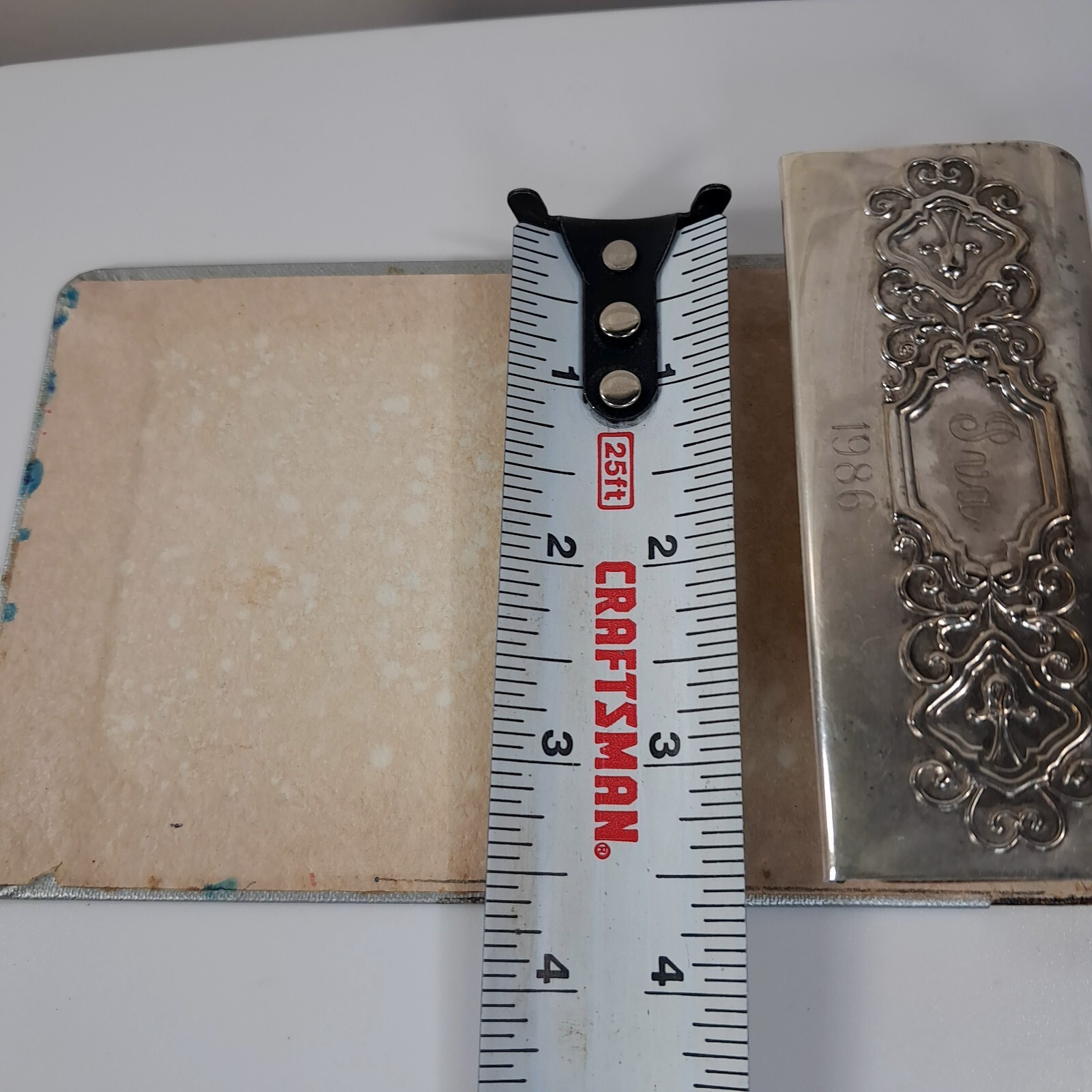 Does not included notepad. Patina/tarnishing/wear as shown. Not sure if this can be polished. Personalized with 1986 and a name.See pics.