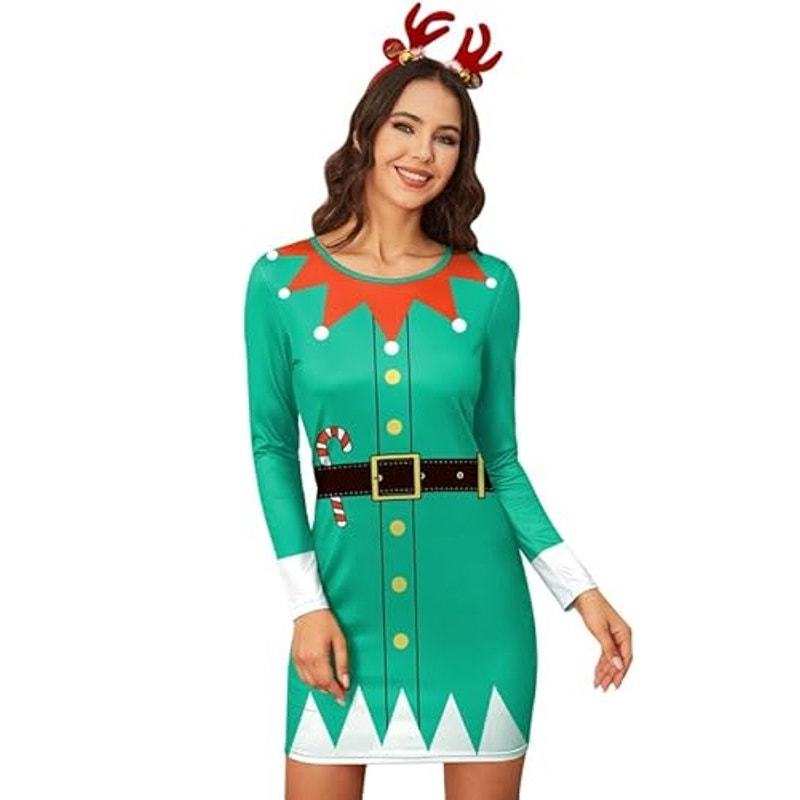 Women's, Womens, Holidays, Christmas, Costume, Pajamas, PJs, Elf, Festive, Party, Family Gathering, Event, Work Party, Dress, Candy Cane, Long Sleeve, Mini, Halloween