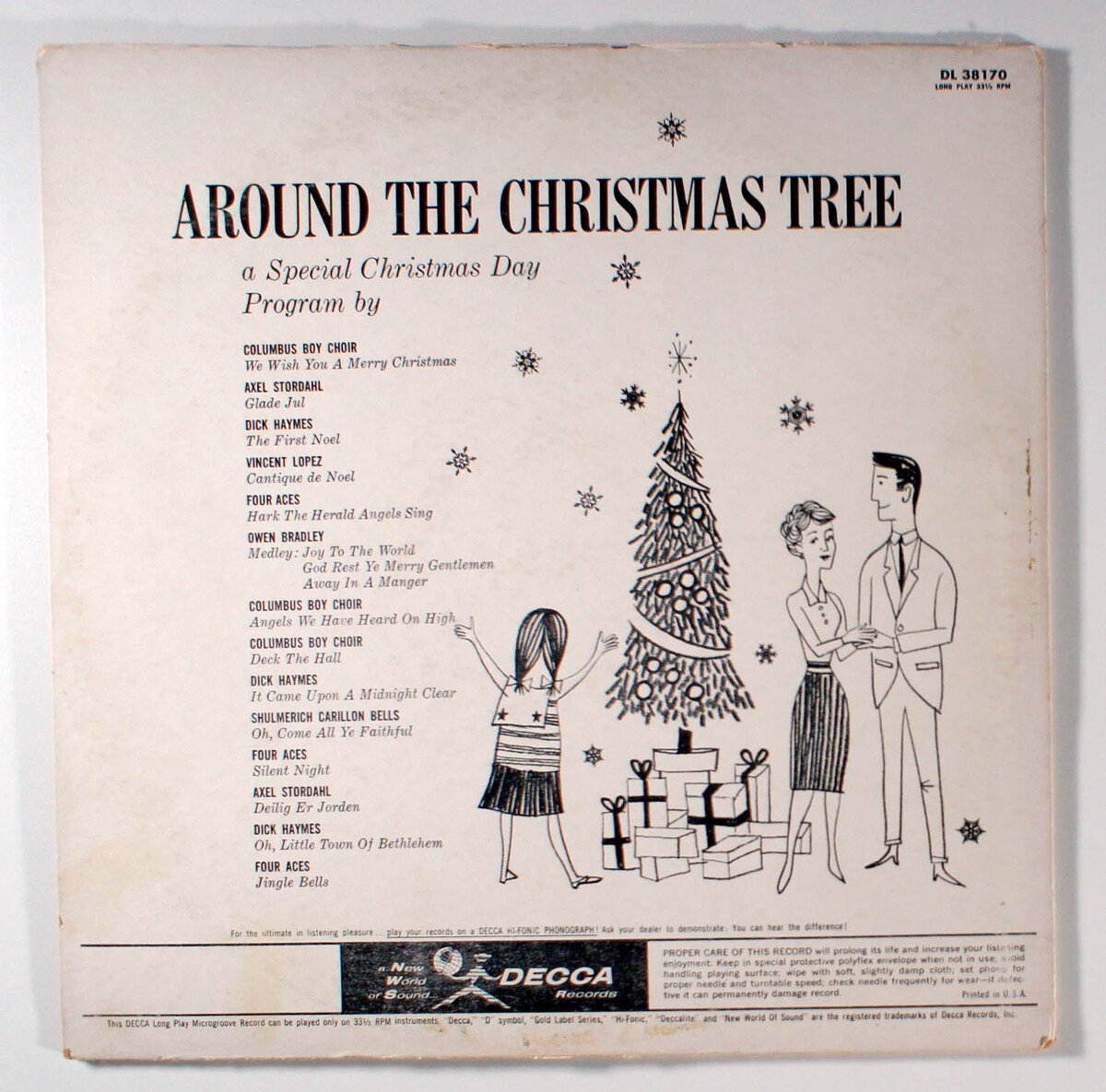 Around the Christmas Tree, by Decca Records features a collection of holiday songs performed by various artists, including the Four Aces, capturing the festive spirit of the era. Released as a vinyl LP, it was designed to evoke holiday nostalgia and is noted for its high-quality sound. The albums historical significance lies in its representation of Deccas early efforts to modernize Christmas music, aligning with the emerging teen-oriented pop culture and rock n roll trends of the late 1950s. Its release on 33 rpm vinyl, a format Decca was exploring for singles at the time, adds to its historical context within the evolving music industry.