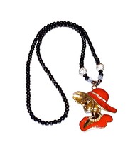 Black beads crystals make up this unique necklace. The charm is a lady in a wide brimmed hate, wearing a string of pearls. Looks like its' never been worn.
