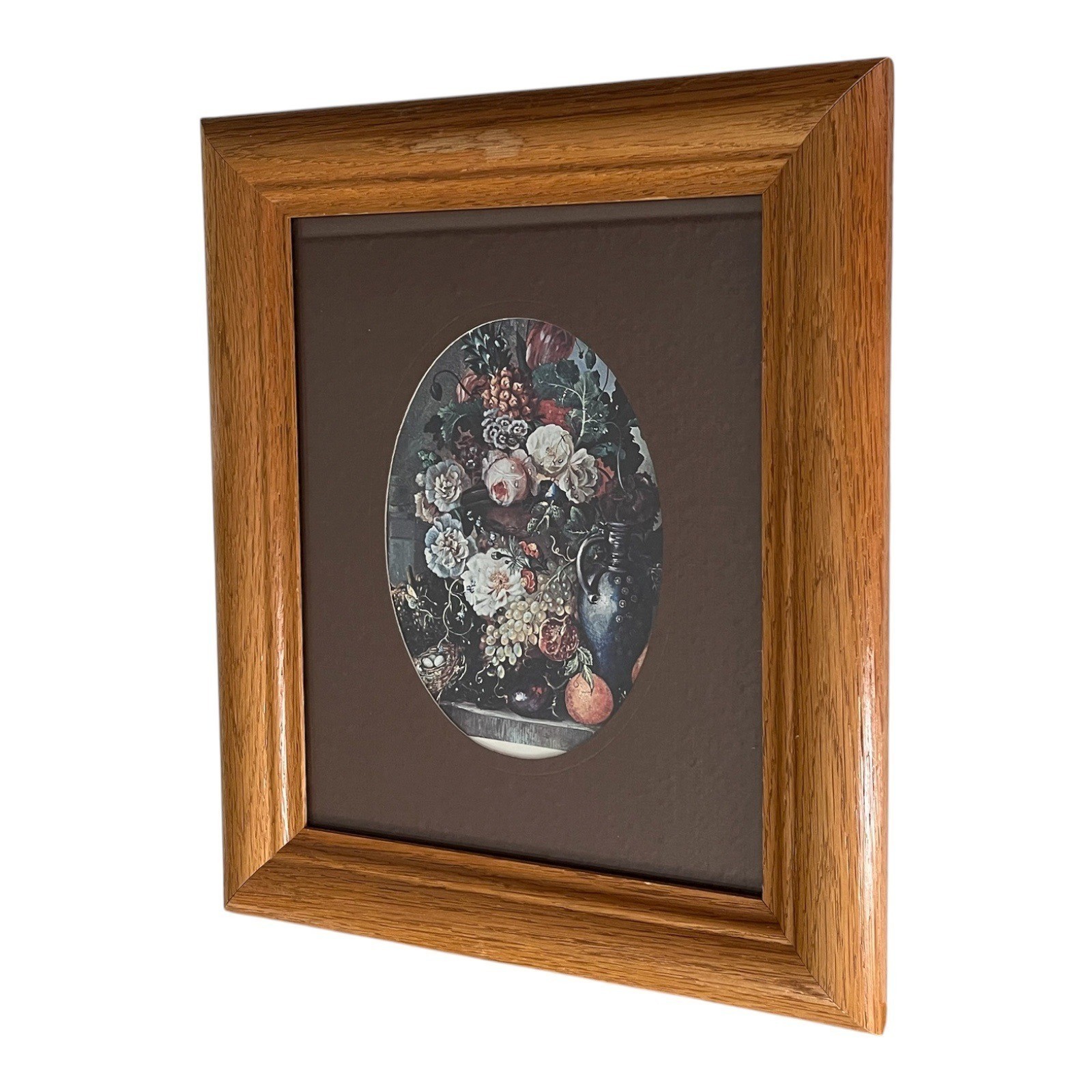 Vintage framed floral still life art print from Spectra Galleries, Inc., North Hollywood, CA. The oval matted image features a rich arrangement of roses, grapes, pomegranates, and other blooms in a dark vase, styled in the tradition of 17th-century Dutch still life paintings. Encased in a sturdy oak-toned wooden frame with brown mat board. Perfect for traditional, vintage, or cottage-style decor.