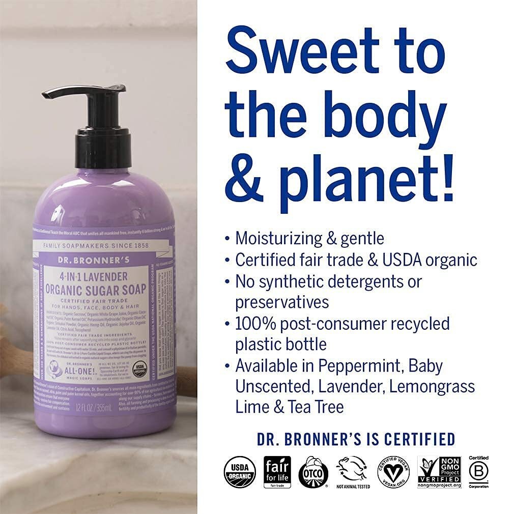 2x Dr. Bronner's - Organic Sugar Soap (Lavender, 12 Ounce) - Made with Organic Oils, Sugar and Shikakai Powder, 4-in-1 Uses: Hands, Body, Face and Hair, Cleanses, Moisturizes and Nourishes, Vegan