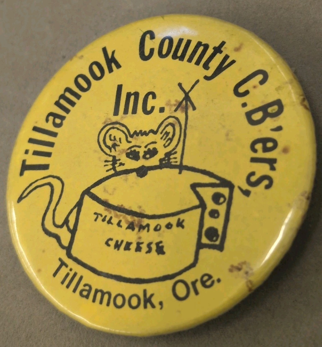 Vintage metal pinback button. Black and yellow advertising featuring a mouse and a wheel of cheese. Tillamook county, Oregon CB radio club. Measures 2.25" across. No smoke or pet odor.