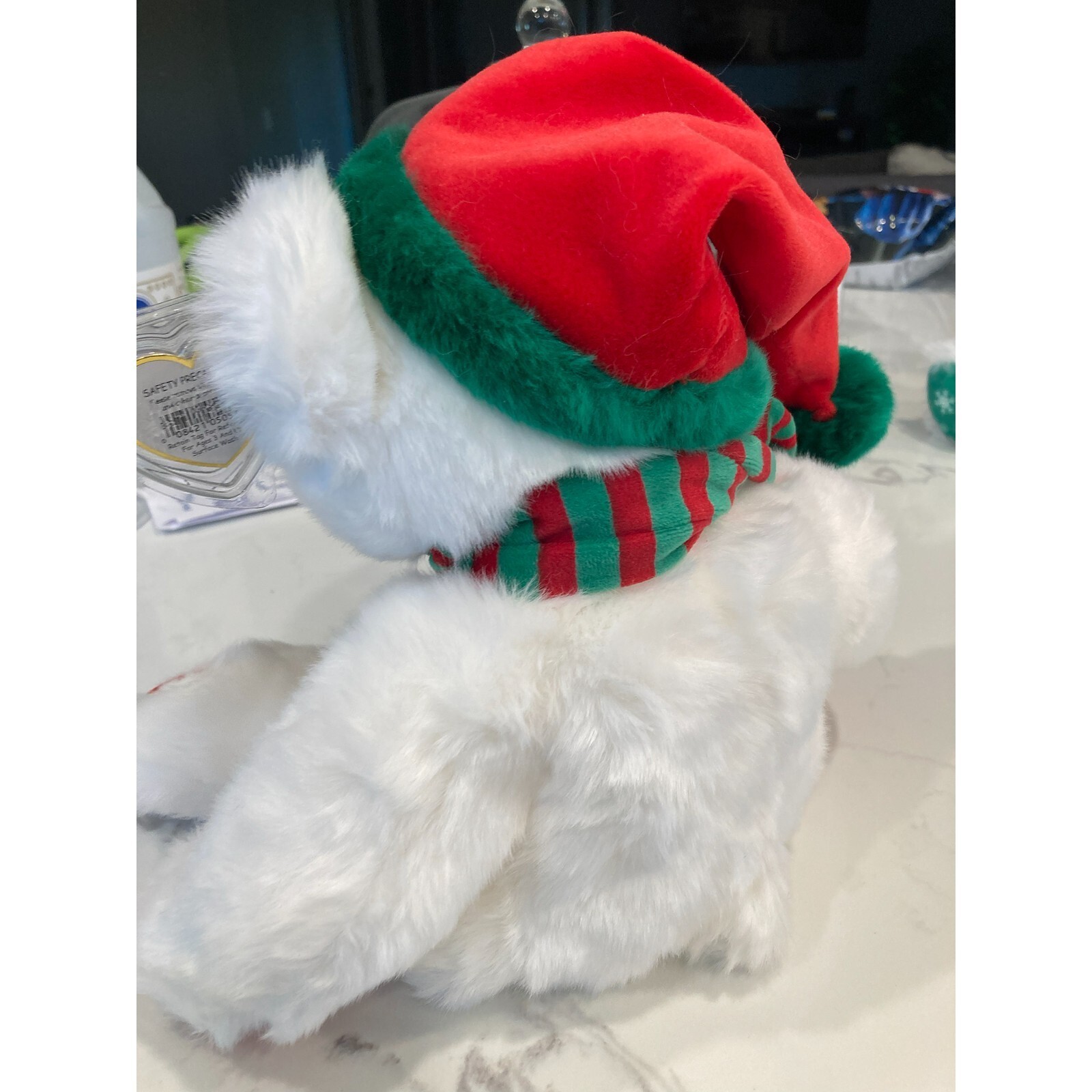 White Furry Bear with Red and White Striped Hat