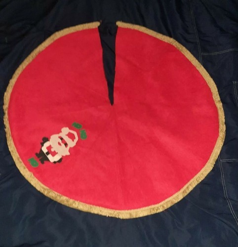 1950s Vintage Felt Red Christmas Tree Skirt - 35'' Santa Claus Hohoho decor. Approximately 35 inches in diameter, not including the fringe. This is from an estate sale featured on 'Ugliest Homes in America' on HGTV episode 5.