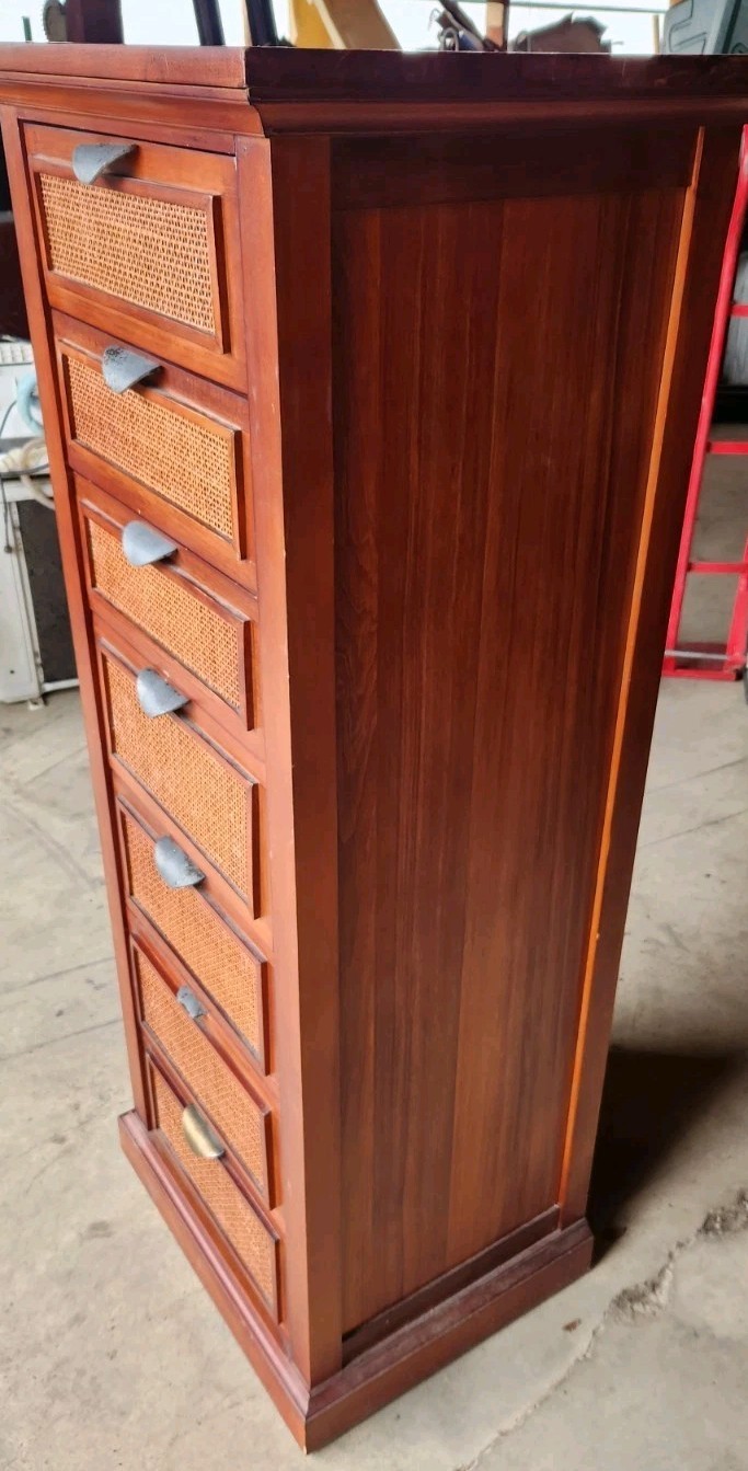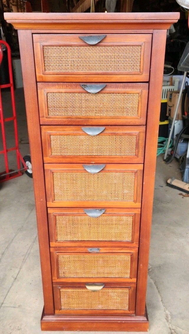 Vintage Pier One narrow lingerie dresser. 7 drawers. One pull is broken. The drawer above the broken pull drawer and the broken pull drawer seem to rub together when opened. Has some other wear from use. Local pick up is the best option due to size. Message with zip code for a freight quote.
