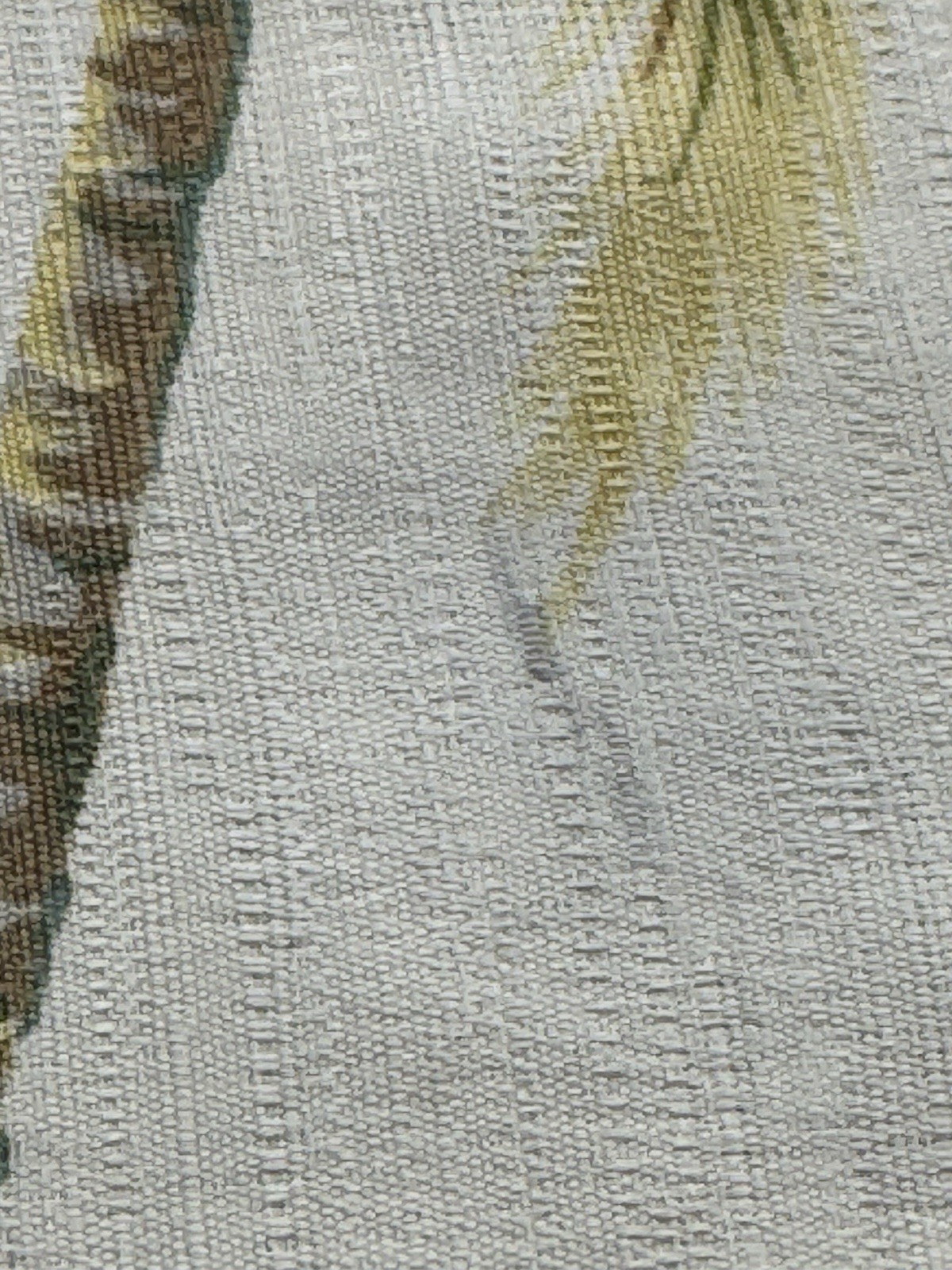 Pale yellowish cream colored background with greens, browns and orange palm trees