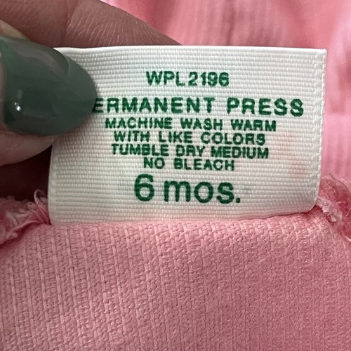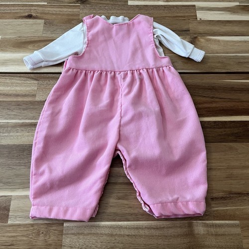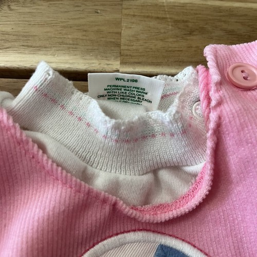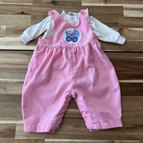 Excellent preloved Condition pink baby girl find well corduroy bib overalls with an applique that is a baby in a stroller. Also included is a white longsleeved shirt that coordinates with the overalls. Both of these are in excellent condition for the age. Please see pictures for measurements.