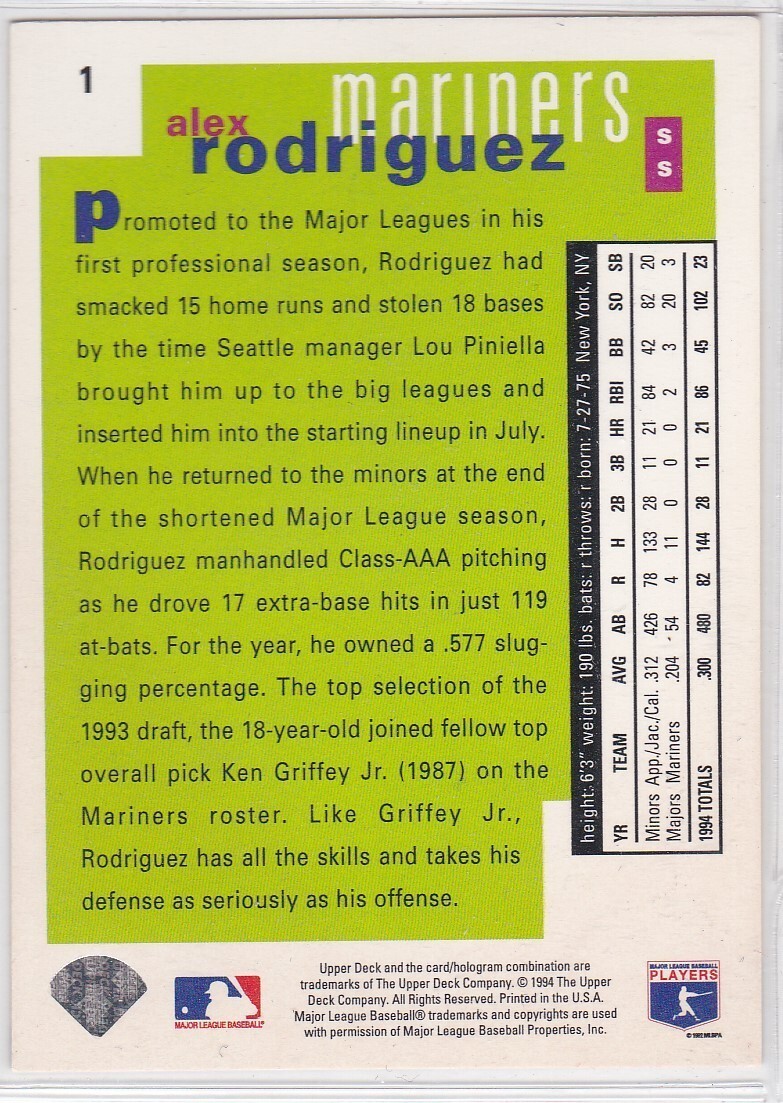 G) 1994 Upper Deck Baseball Trading Card Alex Rodriguez #1