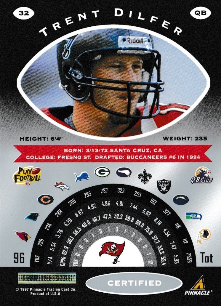 1997 Pinnacle Certified Football Trading Card Trent Dilfer Tampa Bay Buccaneers