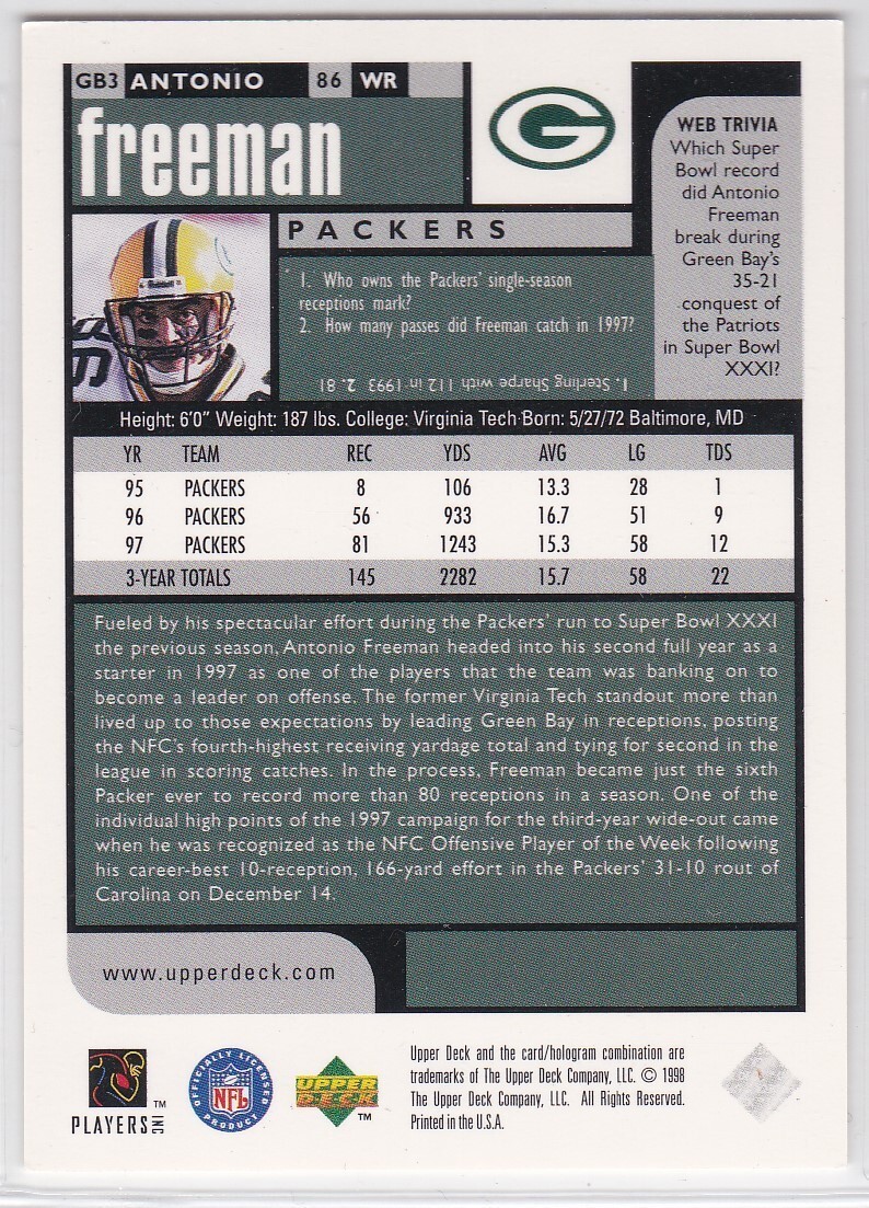 G) 1998 Upper Deck Choice Football Trading Card - Antonio Freeman #GB3
