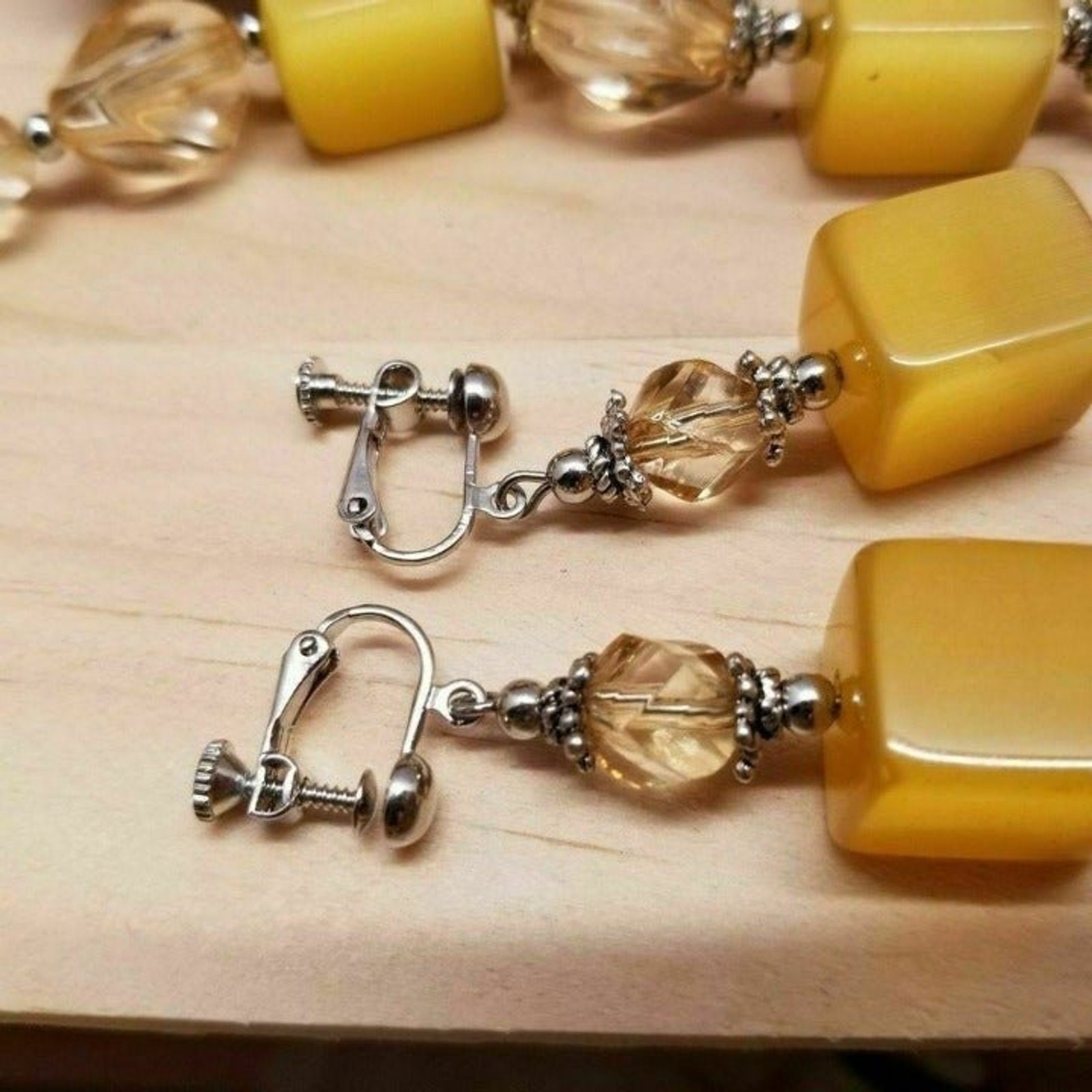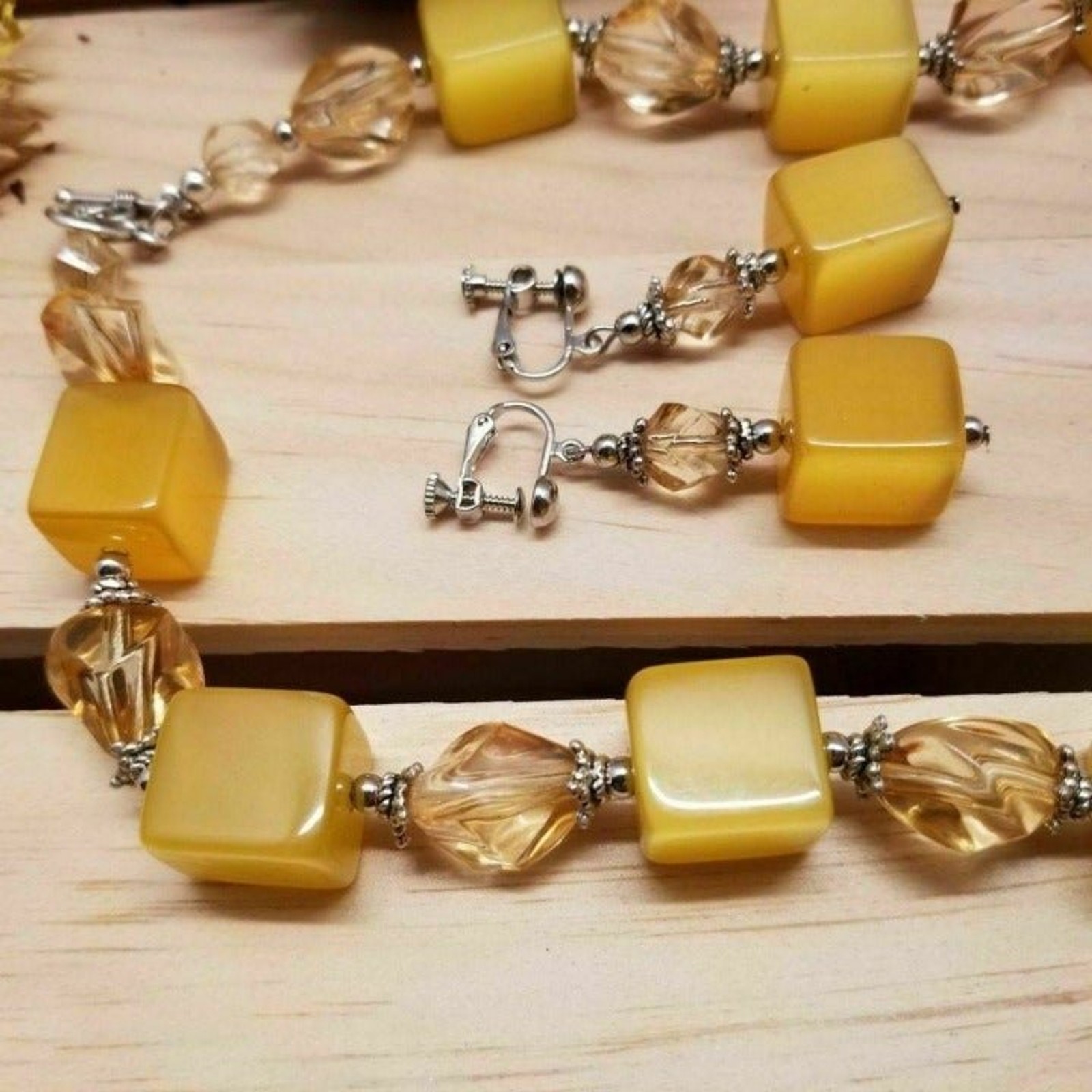 Vintage Yellow Moonglow Cube Necklace & Earring Set – 22" Retro Jewelry