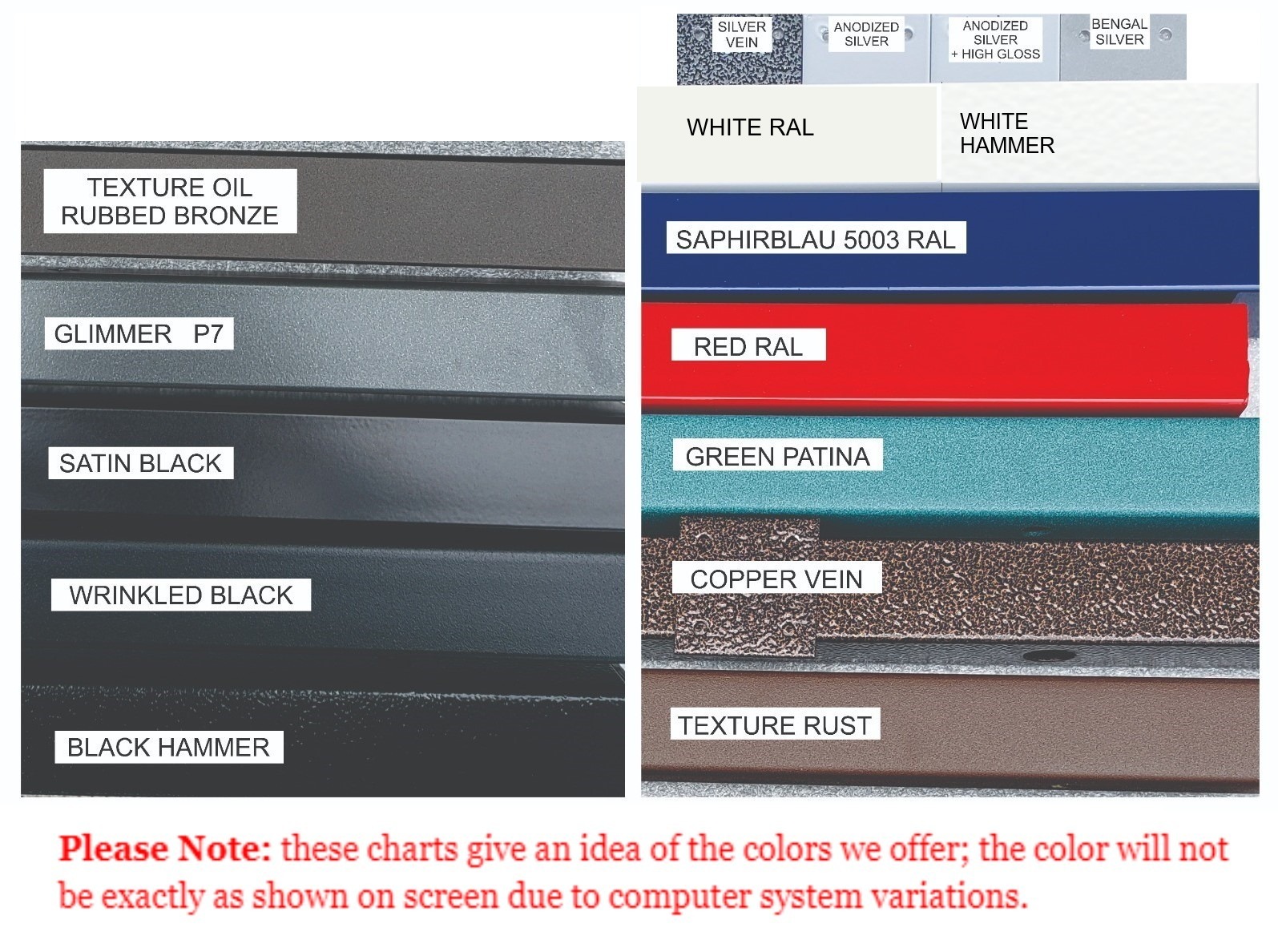 Following are custom powder coating colors available at no additional charge.