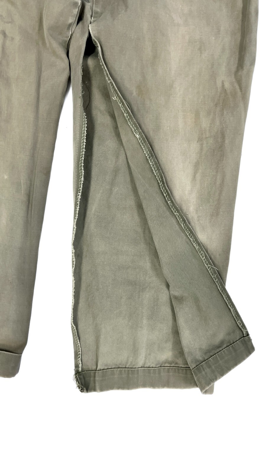Provenance Note: Utility pants like these were standard for tradesmen and laborers in the 1940s, built of hardwearing cotton twill with gusseted reinforcement for freedom of movement. Surviving examples in green twill are scarcer than khaki, and collectors value their authenticity and rugged wear.