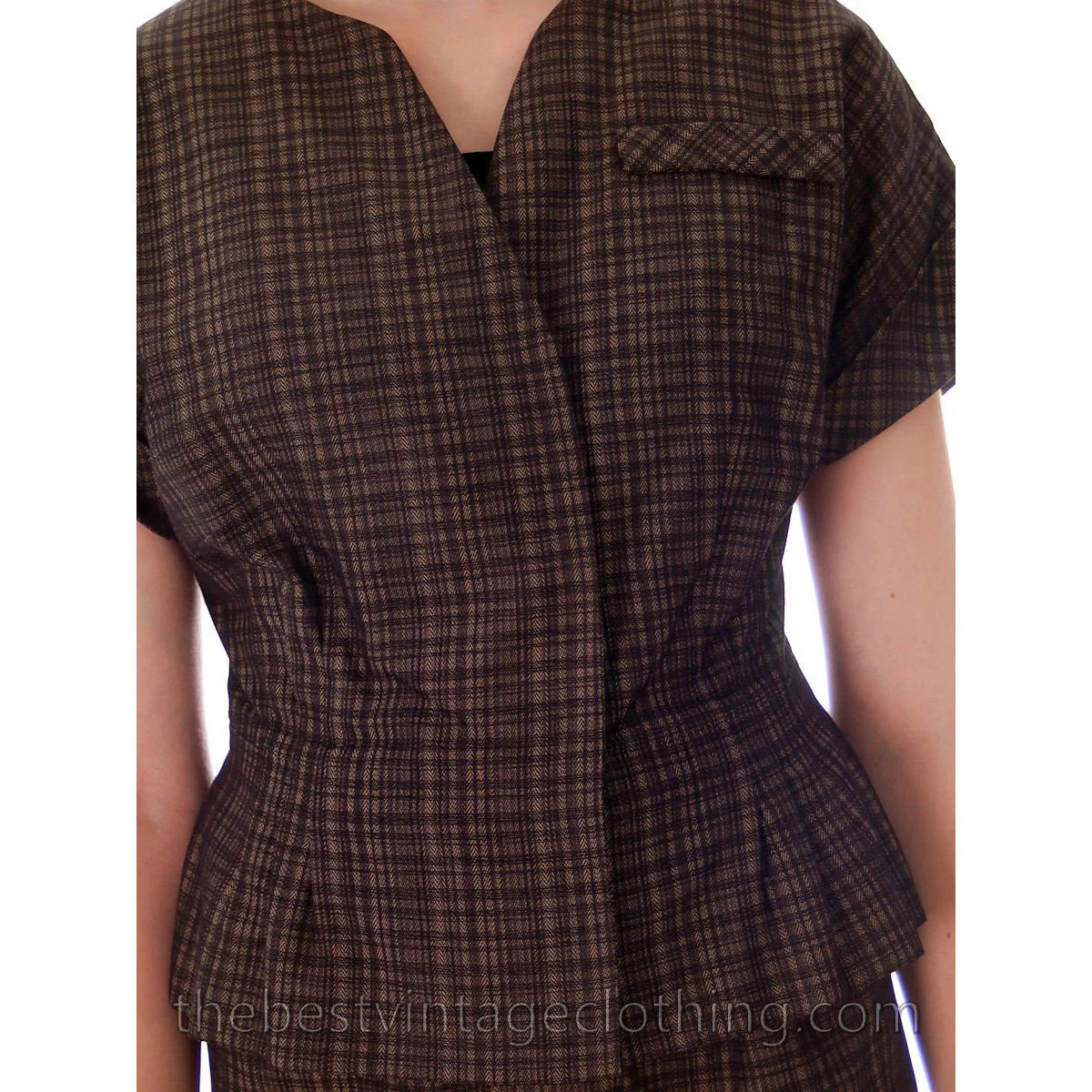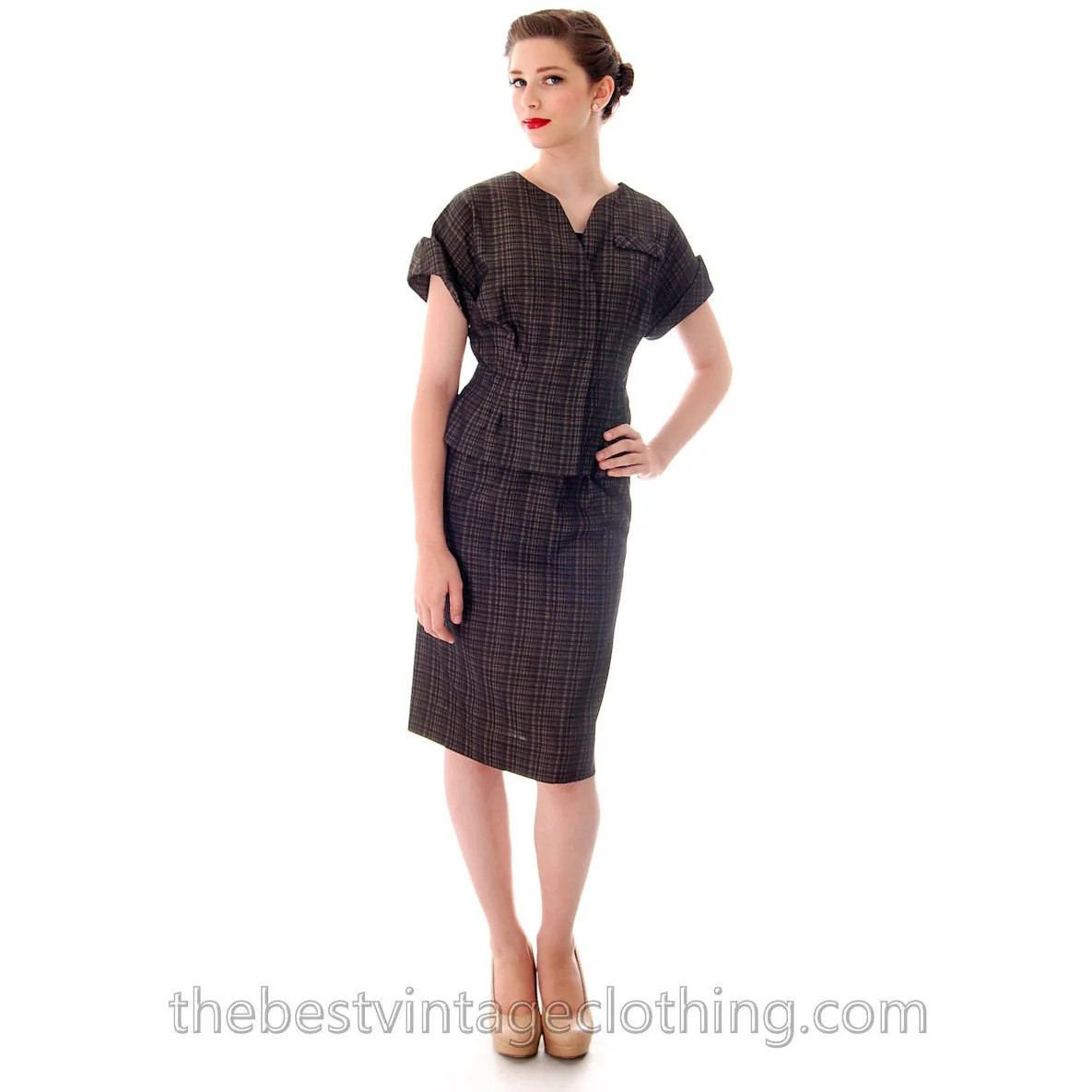 Elegant 1940s silk plaid couture suit by Blums-Vogue, Chicago, in taupe and black with subtle chevron weave. Features a sculptural peplum jacket with hidden closure and a straight pencil skirt with slit. Exquisite tailoring and couture-level construction.