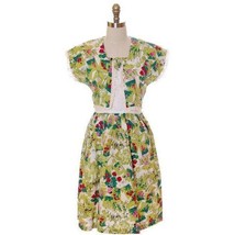 Fabric: Cotton seersucker · Potted plant novelty print · Faux vest with eyelet bodice · Side zip closure · Padded shoulders · Gathered skirt